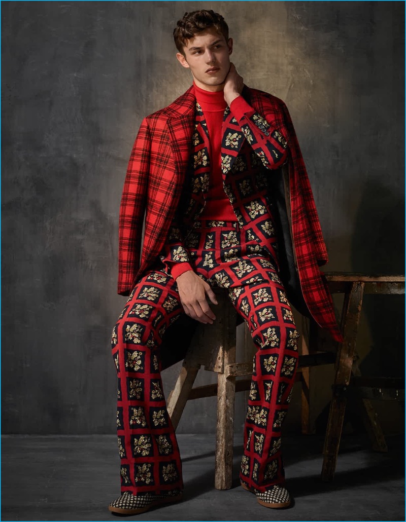 PinEmbracing a pajama-inspired look, Kit Butler wears a check coat and trousers with shearling slippers by Fendi.PinDamian Foxe photographs Kit Butler in a red and black buffalo check wool suit, shirt, and sweater, worn as scarf.