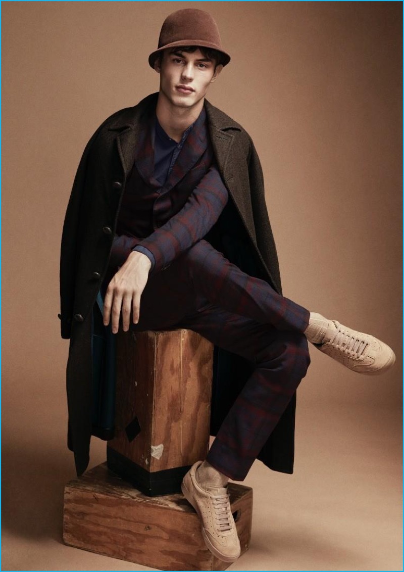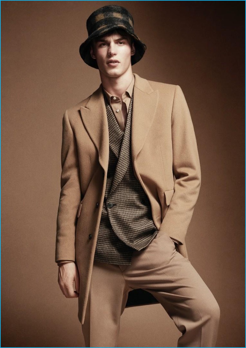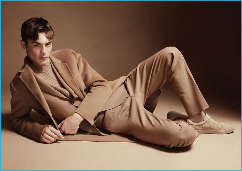 PinDressed in camel wool fashions, Kit Butler dons a Joseph sweater, suit and coat with Fred Perry sneakers.
