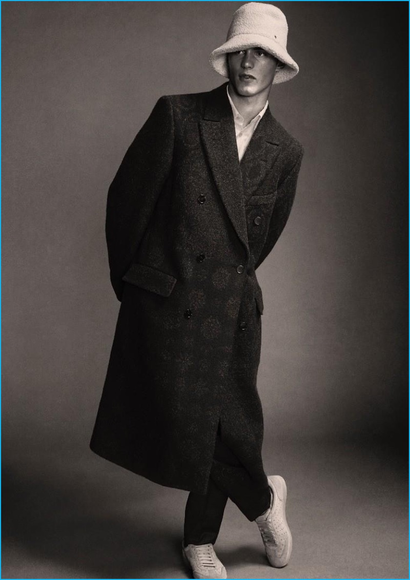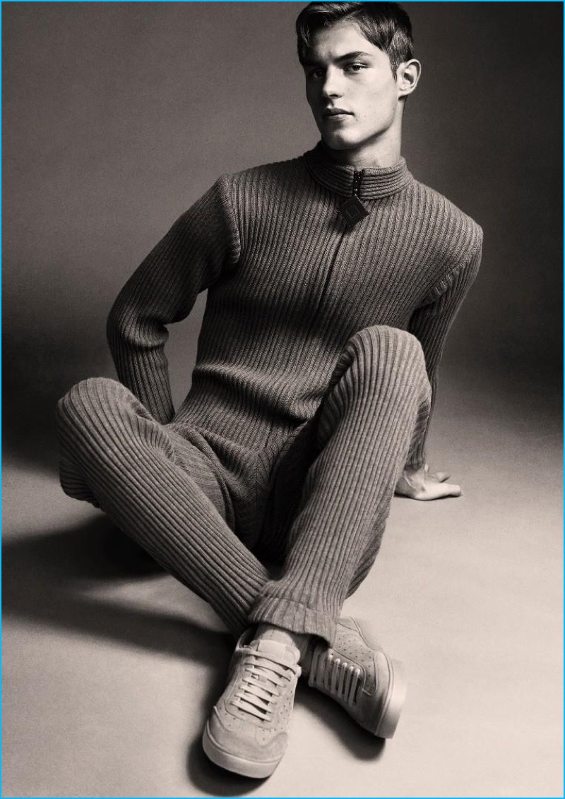 PinJonathan Ailwood outfits Kit Butler in a ribbed wool jumpsuit from Pierre Cardin.PinAppearing in a Wool editorial, Kit Butler sports a Paul Smith shirt, wool jacket, and trousers. Kit also wears a Maison Michel wool hat.