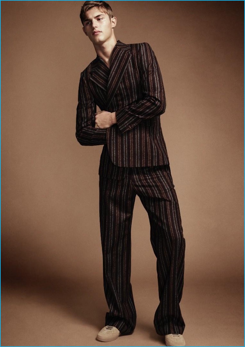 PinKit Butler sports a Giorgio Armani vest with a wool bomber jacket, two-piece suit and hat.PinModel Kit Butler dons a striped Dries Van Noten wool suit.