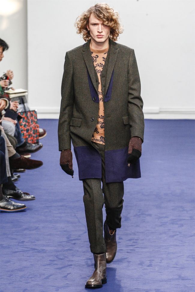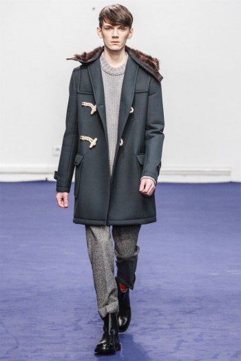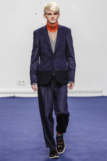 The In-Between–Adding to a sensible fall/winter 2013 wardrobe, Kolor’s young man adopts sportswear, mixing casual and formal elements with a splash of color. Beginning with zipped turtlenecks, the traditional attitude of suiting is disrupted and playfully updated with traced seams, color blocking and more. Blurring the line between tailored and relaxed, the strength of Kolor’s outing is in the details. While coats are cropped and layered with cable-knit sweaters, trousers are quilted and cut with a quirky semi-relaxed fit.