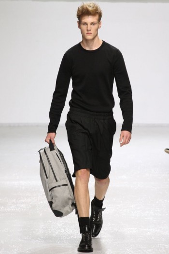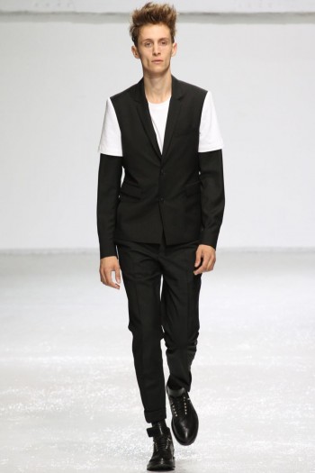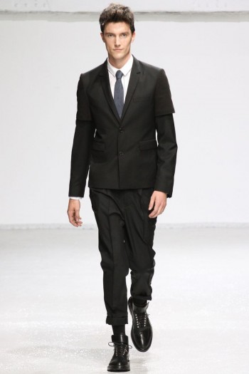Man’s Best Friend–The casual nature of his recent collaboration with denim label Lee must have really struck a chord with Kris Van Assche as the designer has arrived at a rather simple inspiration for his latest collection, the t-shirt. Tackling the ultimate wardrobe piece, which every man has, Van Assche reinterpreted the classic, pulling it in different directions, presenting relaxed tailoring and an urban draw. Instantly achieving a downtown cool, the t-shirt appeared layered with a long-sleeved shirt when in actually the sleeves zip off. Meanwhile, khakis were reinterpreted as jogging pants with elasticized ankles. The perfect complement to this season’s attitude, a new lineup with Lee prevailed as Van Assche mixed denim pieces with his white standard. Returning back to jackets and dress shirts, the t-shirt was used to dissect the norm with short white sleeves appearing layered over black. Juxtaposed with caps, windbreakers and parkas, Kris Van Assche presented a picture of a hip urbanite with the power to walk the sophisticated walk with sportswear in toll.