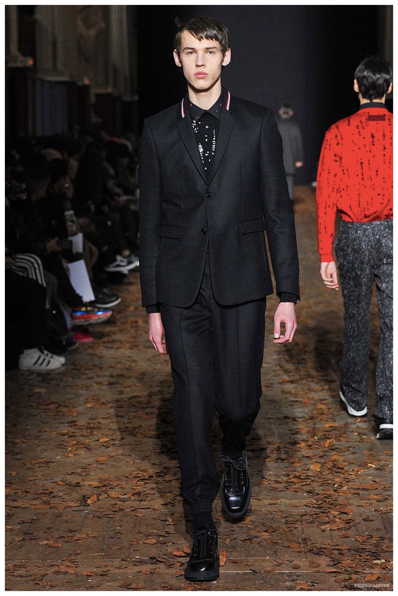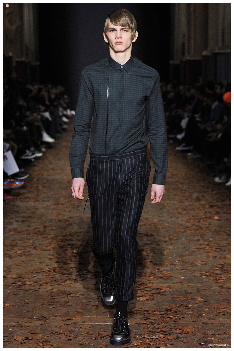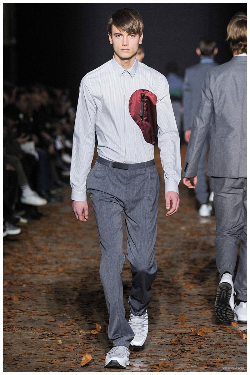 Entitling his fall-winter 2015 menswear collection Concrete, Belgian designer Kris Van Assche infused his concept of seamless daily style with the image of the urban man. Van Assche explains, “For this season I had in mind the image of an urban soldier. It is fundamentally an urban collection because I like suits, active wear and active characters. This time, I wanted the sporting element that I frequently return to, to be almost military in feel. I could imagine a guy on a bike in New York risking life and limb–a sort of city warrior. I wanted a look that felt streamlined rather than relaxed: energetic, fast, precise. In many ways it is an idea of sportswear meeting the New Wave; technical clothes with an aggressive, post-punk tailored attitude.” The designer’s vision translated into the transformation of a slim-fit suit. The lean structure gave way to a cycling ensemble featuring layering and a camouflage print. A military motif also played a role in the new collection with strong prints and aggressive details.