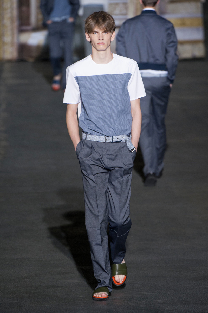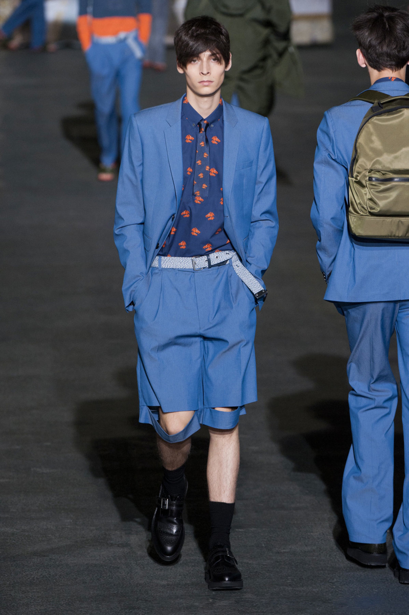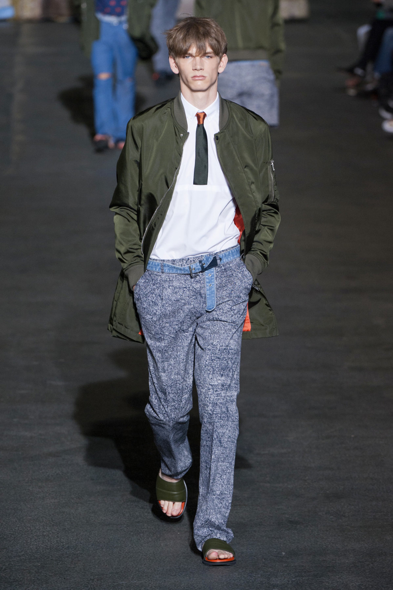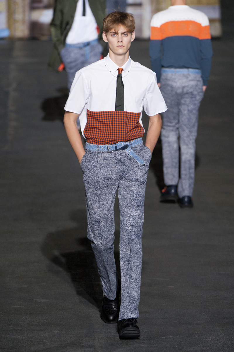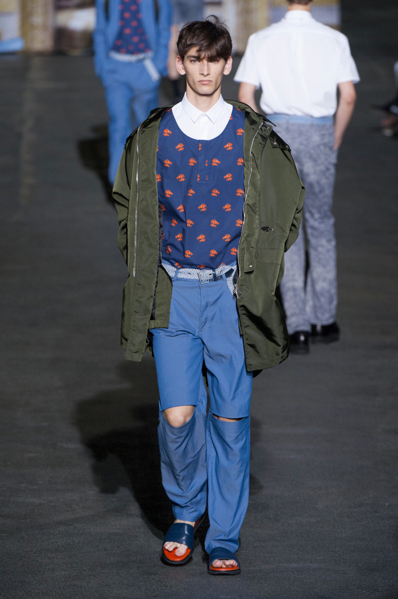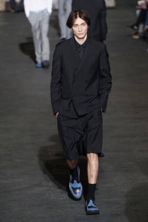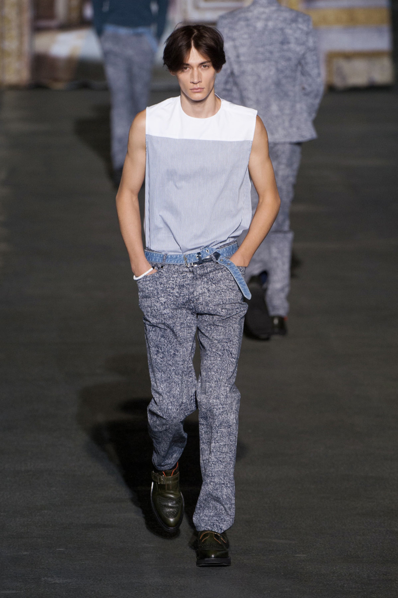 KRISVANASSCHE Spring/Summer 2015–Add Belgian designer Kris Van Assche to the mix when it comes to next season’s denim trend. However, standing out from his peers, Van Assche remixed the menswear classic, using it as trim for a collection of sophisticated sportswear. The collection at large was about mixing and matching, delivering the unexpected in a tasteful manner. Similar to denim, trousers and tailored shorts were ripped for a casual statement. Denim belts tied the collection together as well as color blocked tops and understated prints.
