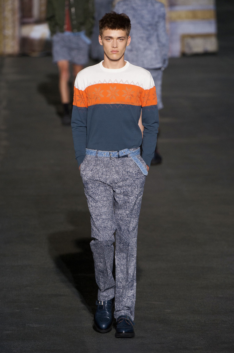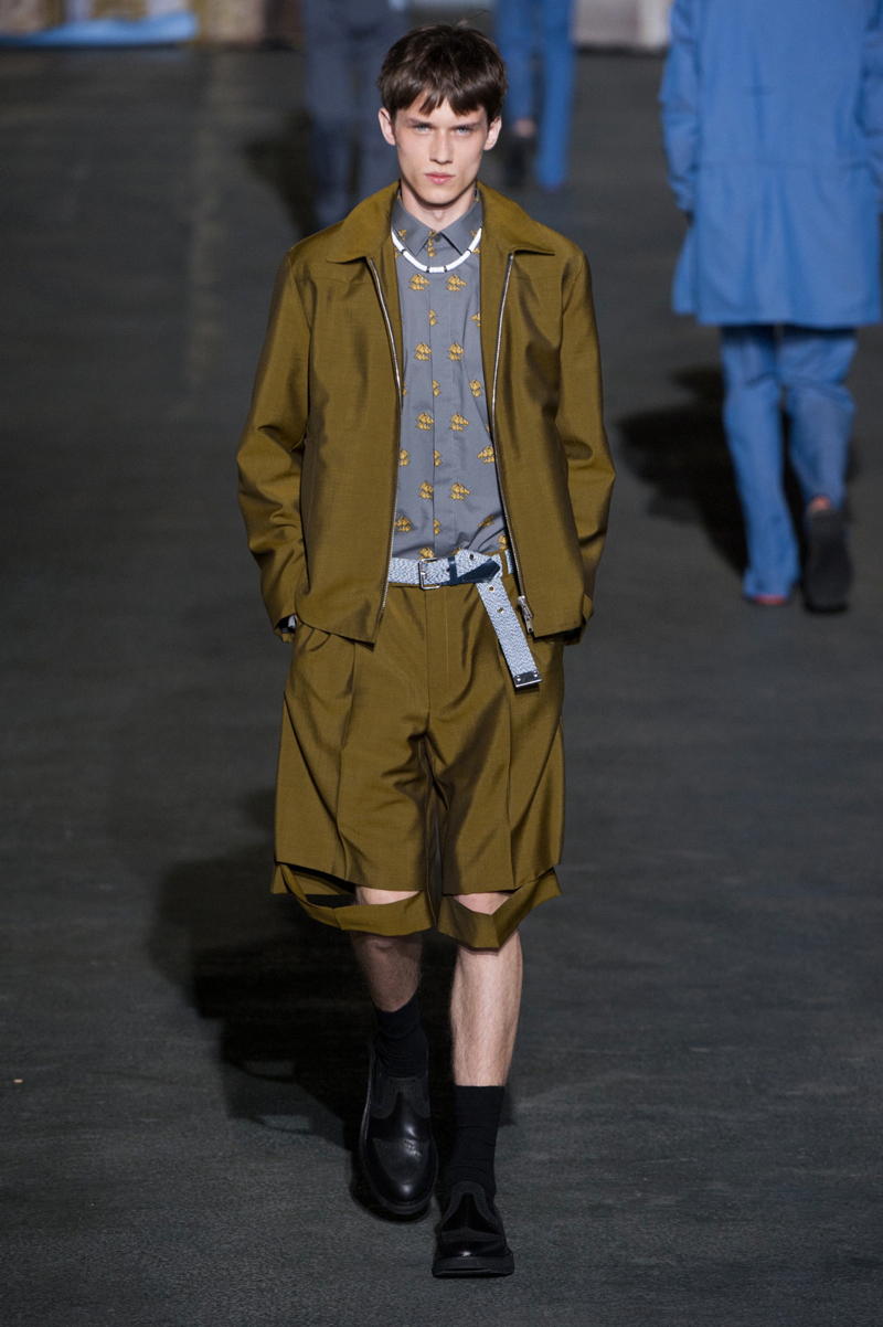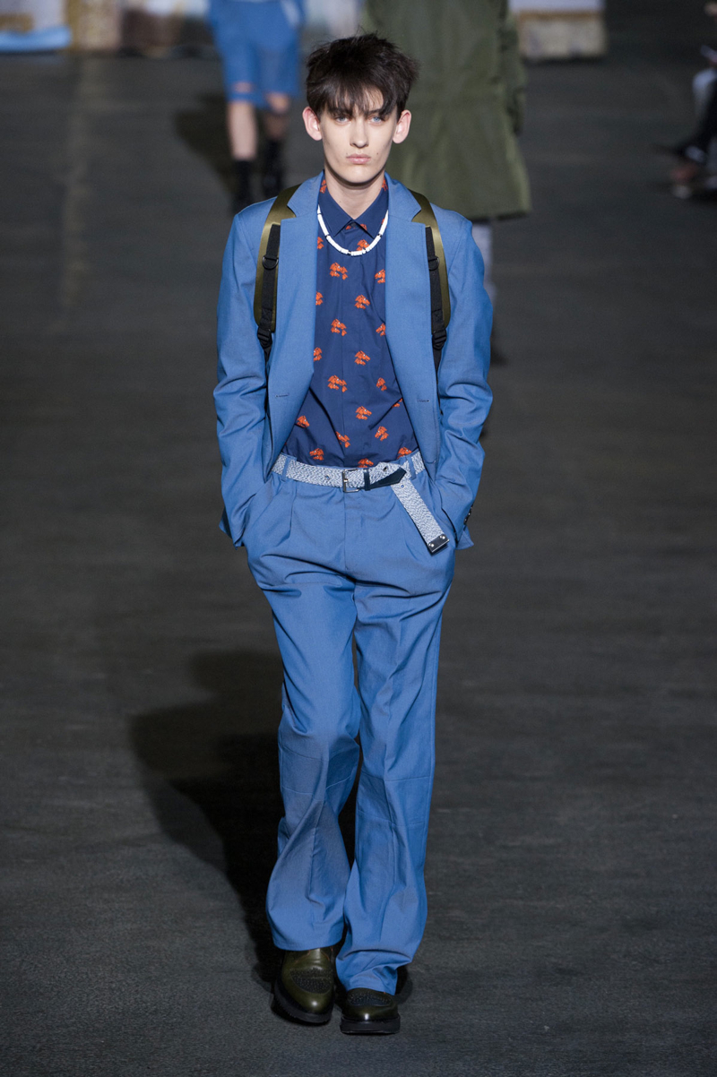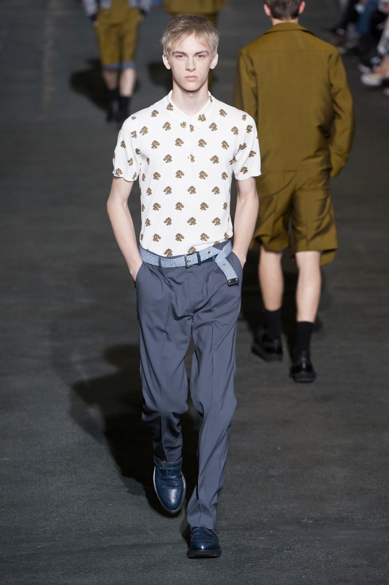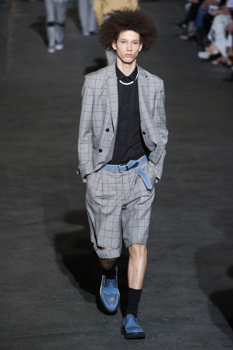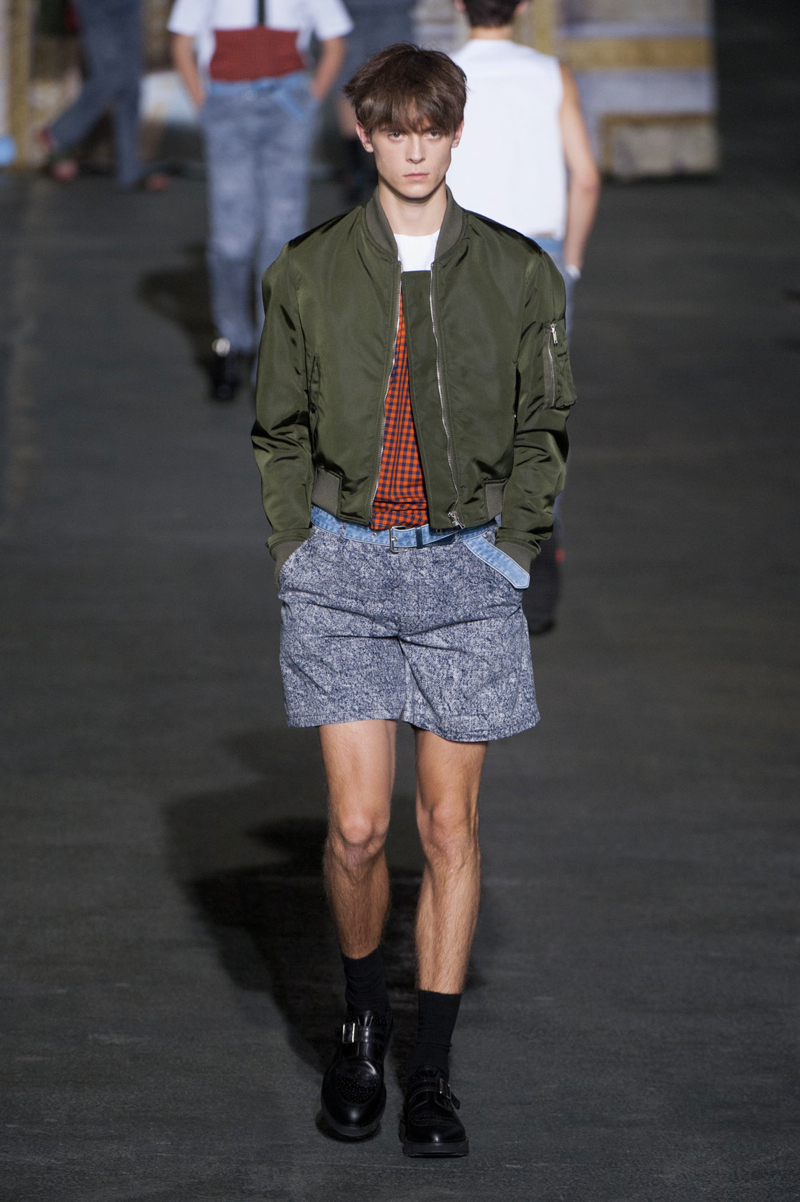 KRISVANASSCHE Spring/Summer 2015–Add Belgian designer Kris Van Assche to the mix when it comes to next season’s denim trend. However, standing out from his peers, Van Assche remixed the menswear classic, using it as trim for a collection of sophisticated sportswear. The collection at large was about mixing and matching, delivering the unexpected in a tasteful manner. Similar to denim, trousers and tailored shorts were ripped for a casual statement. Denim belts tied the collection together as well as color blocked tops and understated prints.