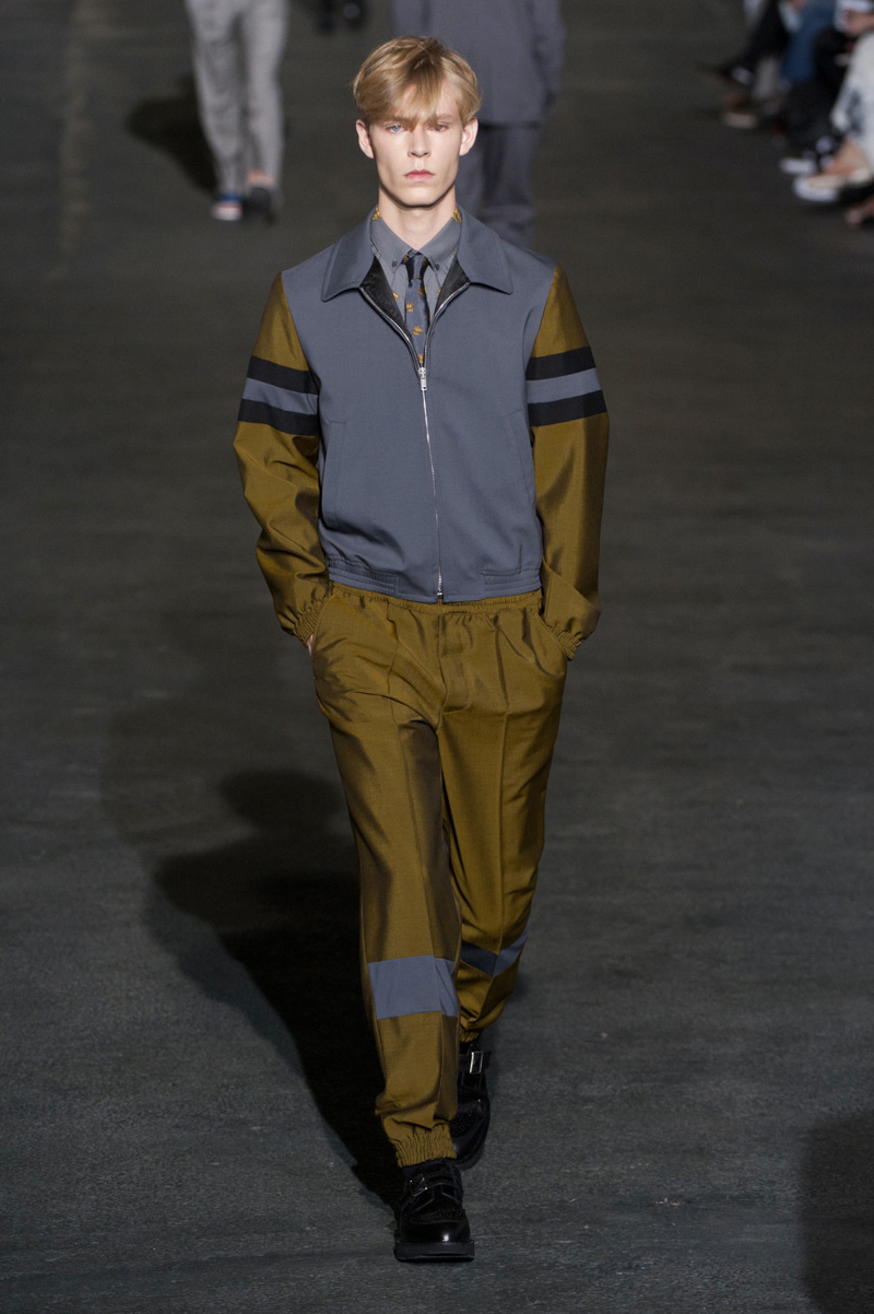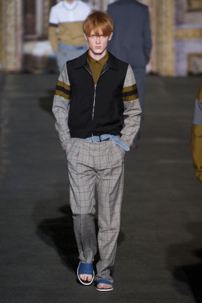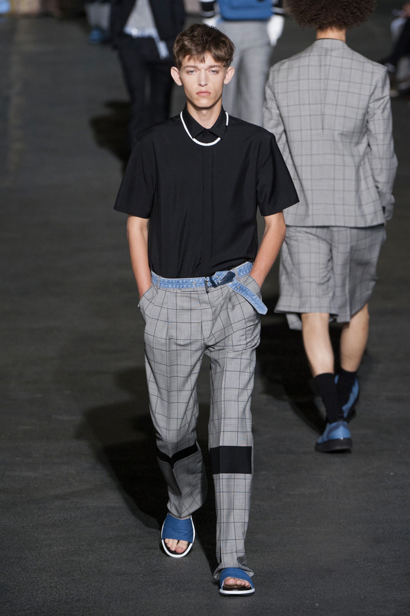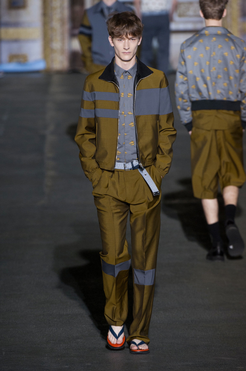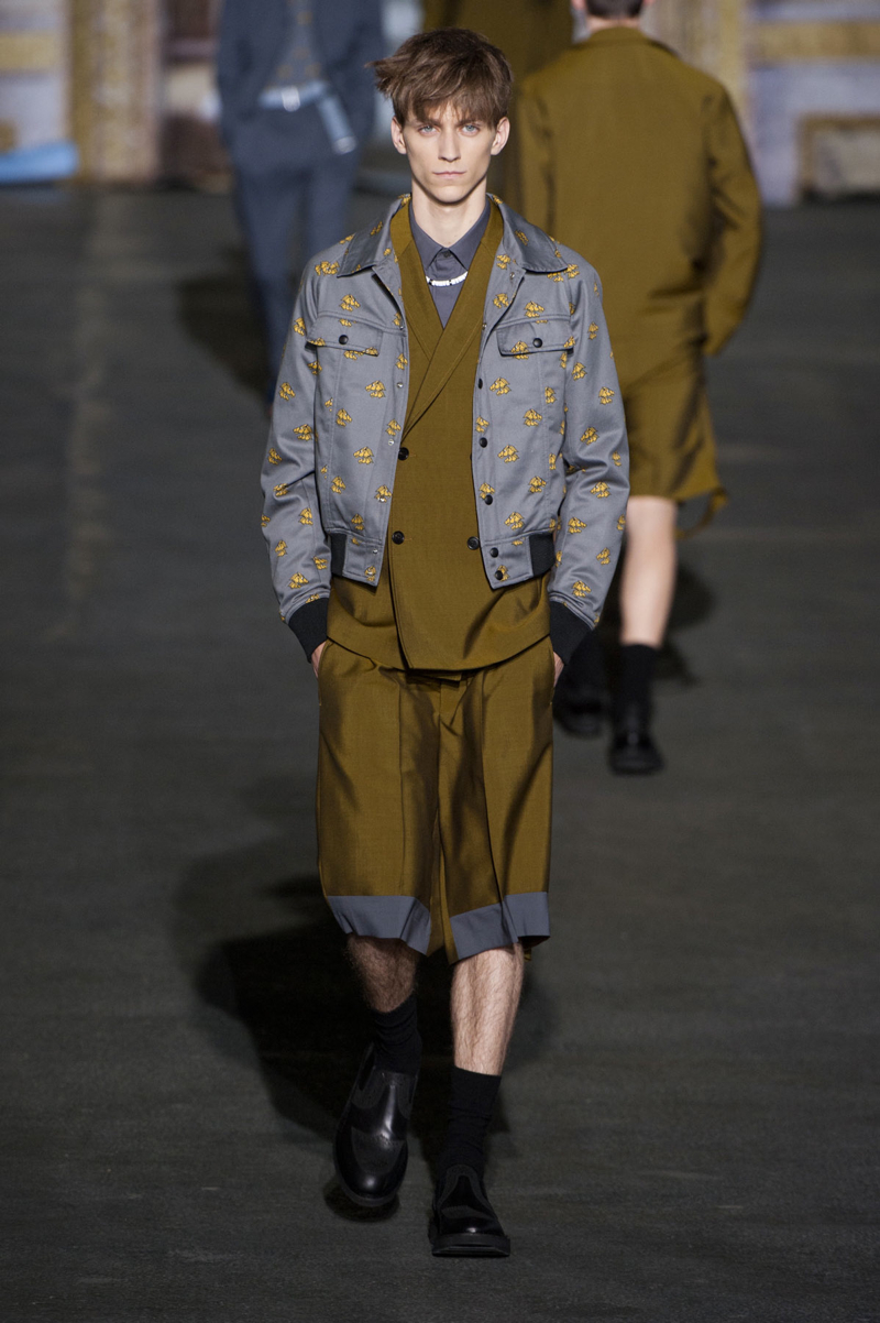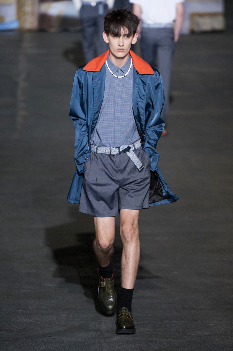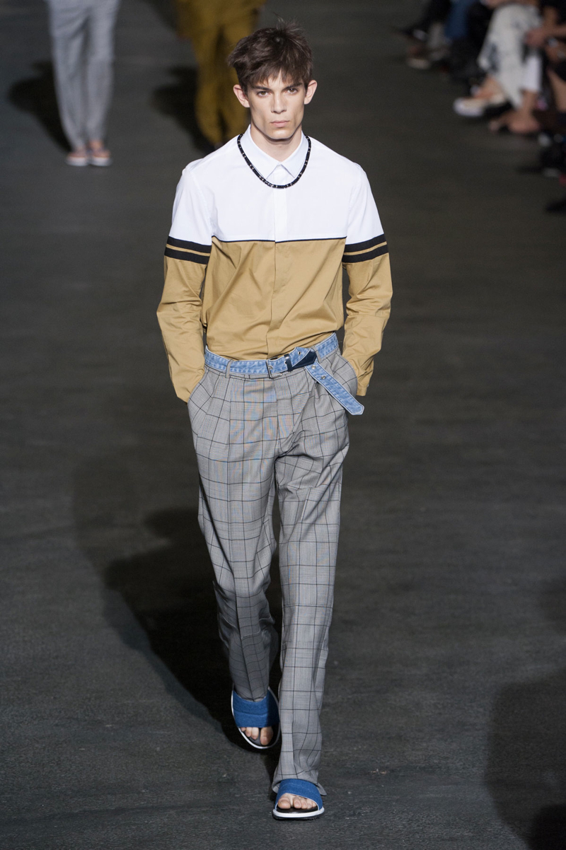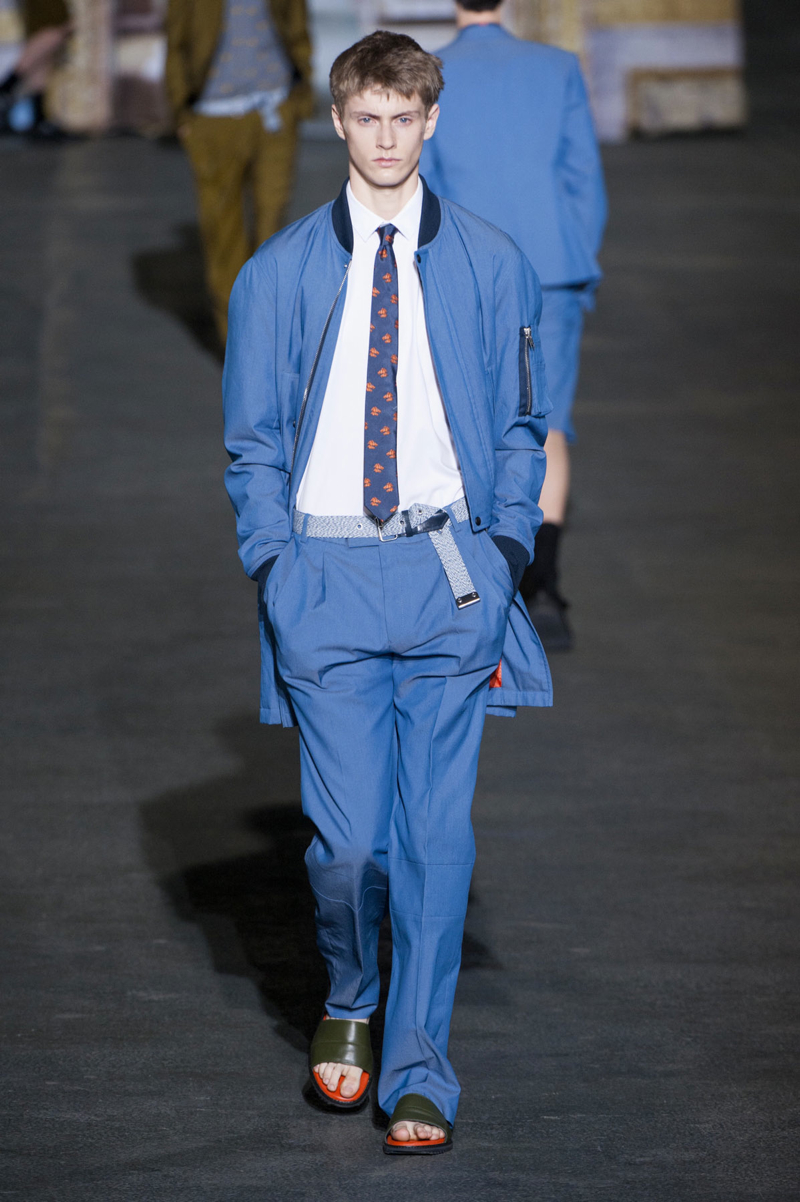 KRISVANASSCHE Spring/Summer 2015–Add Belgian designer Kris Van Assche to the mix when it comes to next season’s denim trend. However, standing out from his peers, Van Assche remixed the menswear classic, using it as trim for a collection of sophisticated sportswear. The collection at large was about mixing and matching, delivering the unexpected in a tasteful manner. Similar to denim, trousers and tailored shorts were ripped for a casual statement. Denim belts tied the collection together as well as color blocked tops and understated prints.