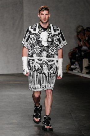 KTZ Spring/Summer 2015–Mixing tribal prints and fearless cuts, KTZ created its own take on gladiators for spring/summer 2015. Not surprising when taking into account the label’s history, black and white were the colors of choice for sporty ensembles. Paired with gladiator sandals, graphic oversized tops created an armor while the use of mesh offered a certain vulnerability. Baggy shorts and voluminous outerwear offered a tough exterior as the show progressed. Creating a light and accessible chain-mail, an intricate print and the use of orange brought the collection full circle, offering varying degrees of fashionable edge.
