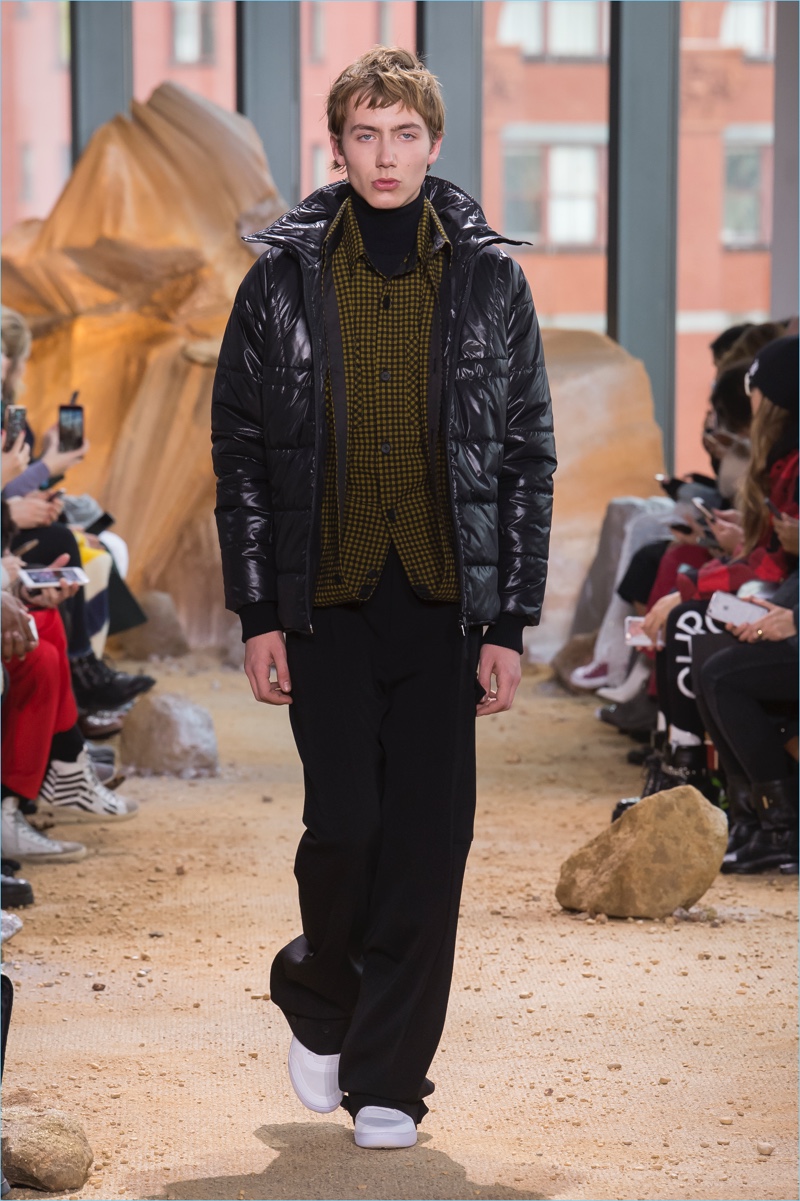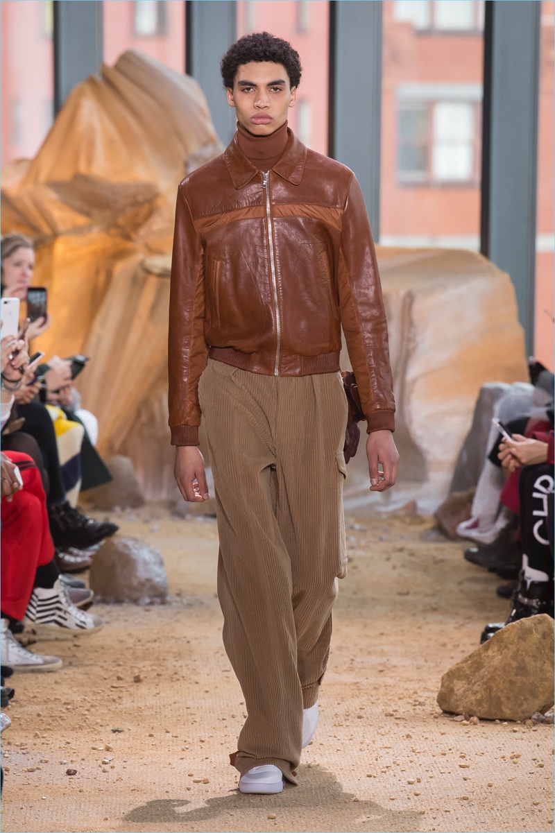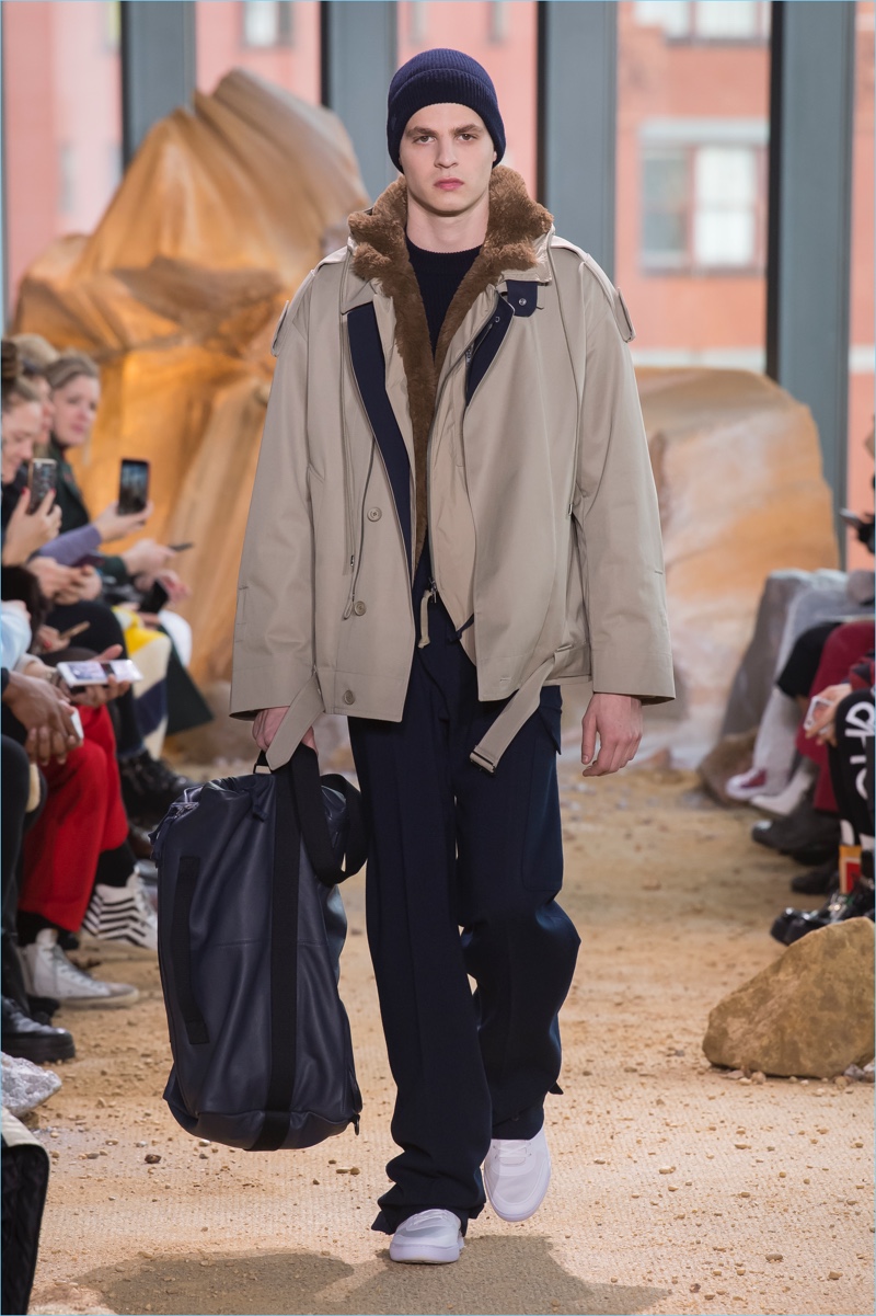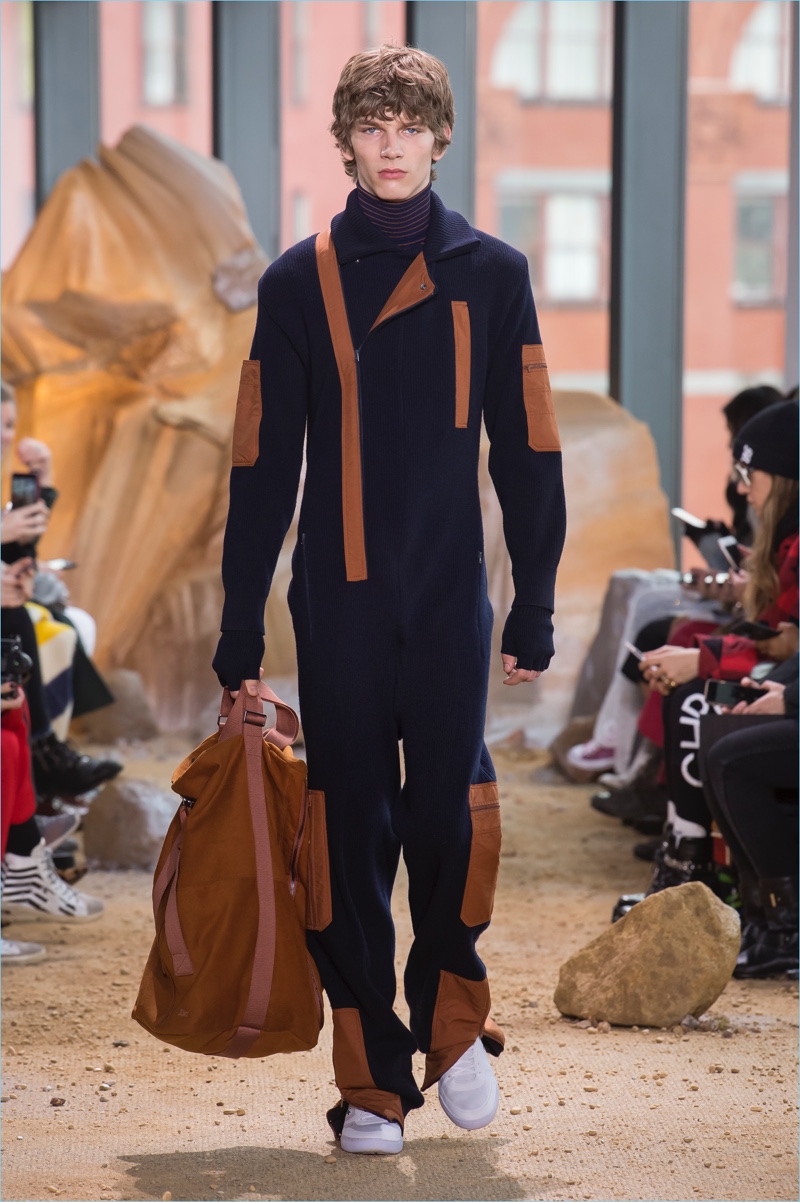 Lacoste most noticeably brings back baggy pants as the brand champions 90s style for its fall-winter 2017 men’s collection. Creative director Felipe Oliveira Baptista looks to René Lacoste’s background in the aircraft industry, as well as his own father’s career as a pilot for inspiration.