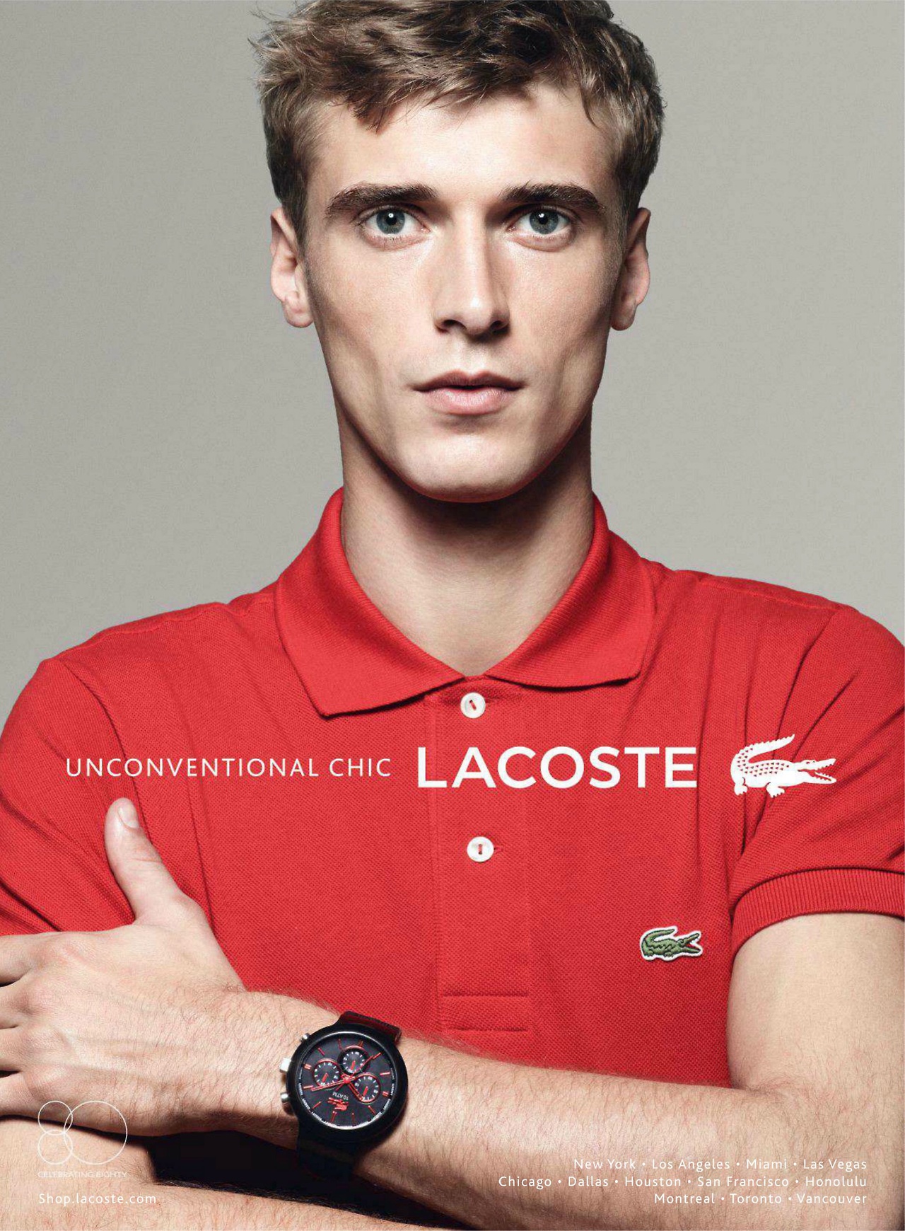 Perfect Timing–There’s no doubt that French model Clément Chabernaud is the favorite face for the spring/summer 2013 season. Reuniting again with photographer David Sims, Clément appears in Lacoste’s spring/summer 2013 watches campaign, styled by Jane How. Posing for a relaxed studio image, Clément sports Lacoste’s iconic polo shirt, paired with an hi-tech black chronograph, embellished with metallic red details. / Hair by Guido Palau. Makeup by Lucia Pieroni.