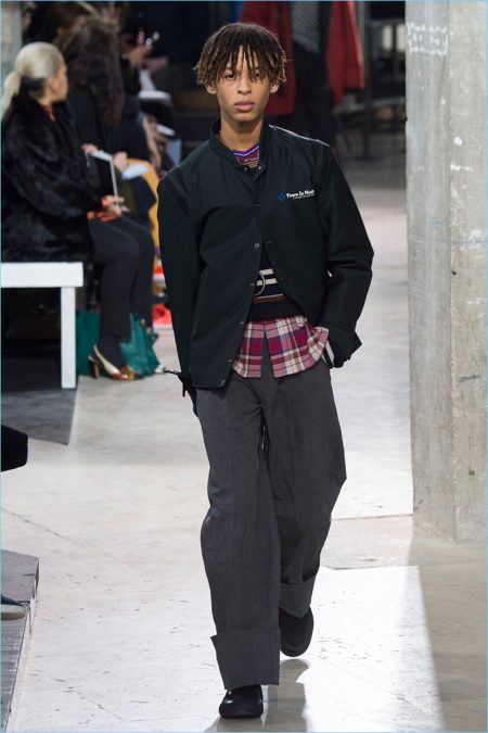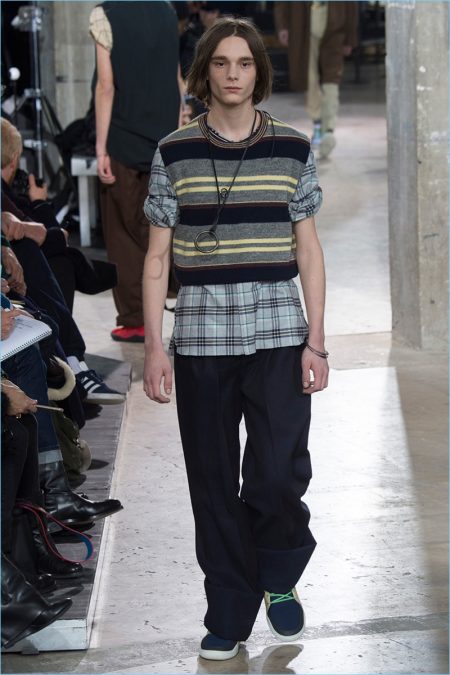 Lanvin men’s creative director Lucas Ossendrijver explores proportions and silhouettes for the fashion house’s fall-winter 2017 collection. A casual attitude blends seamlessly with an exaggeration of cut details for a fun range.