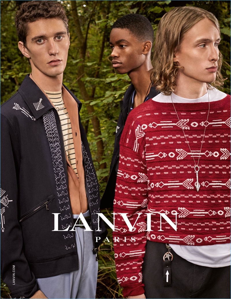 Lanvin takes its festival-inspired collection outdoors for its spring-summer 2017 campaign. Photographer Collier Schorr brings an understated charm to the advertisement. Here, models Joby Barrett, Montell Martin, Rich Cole, and Tony Minenkov come together under the creative direction of House & Holmes. In addition to clean tailoring, the models don striped and graphic fashions.