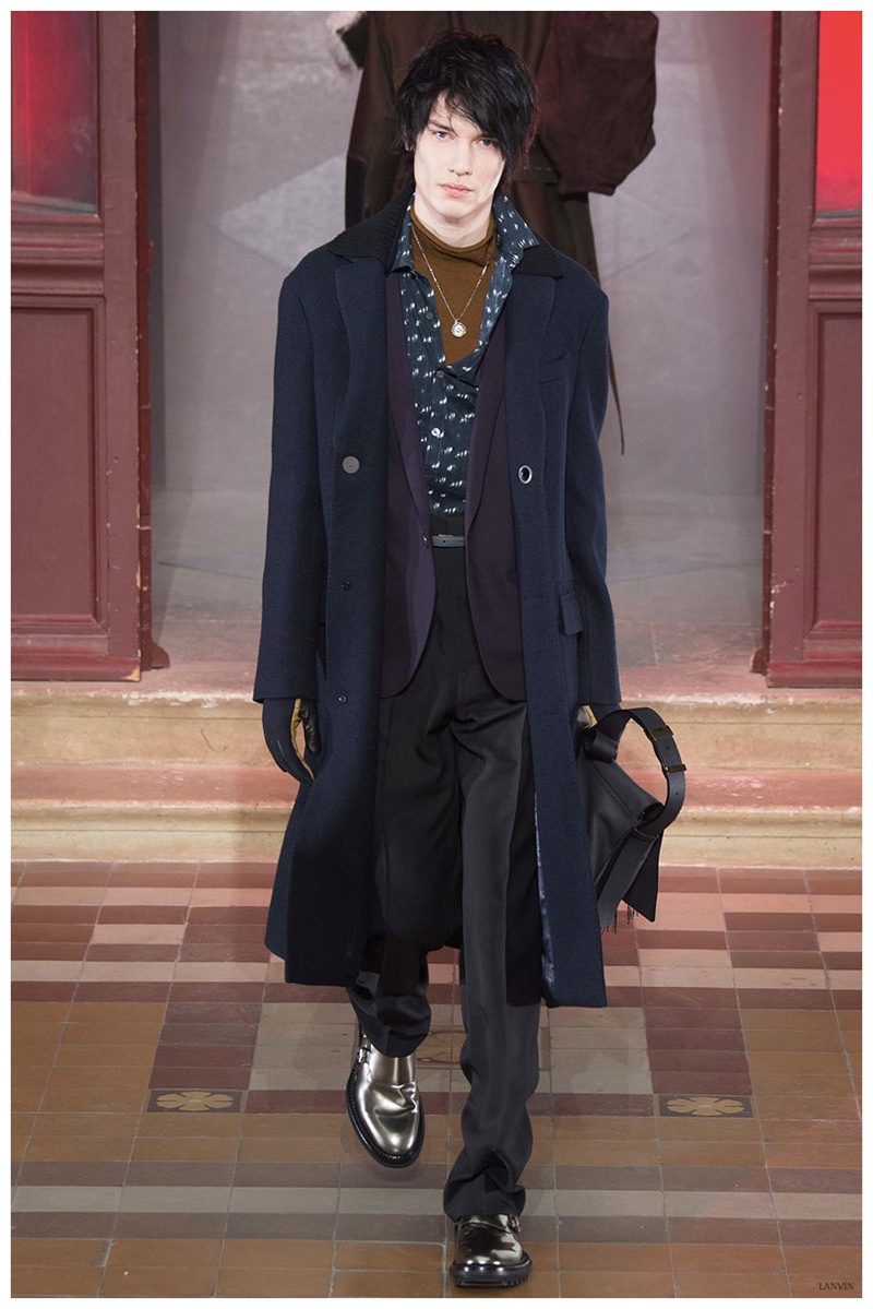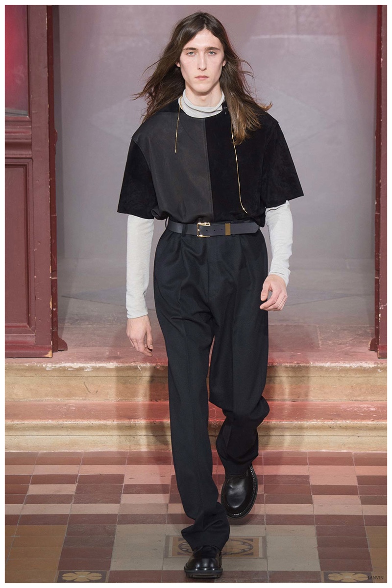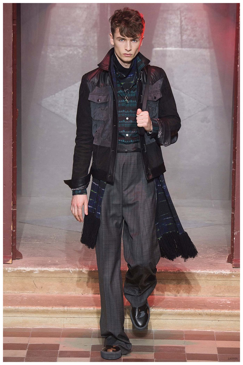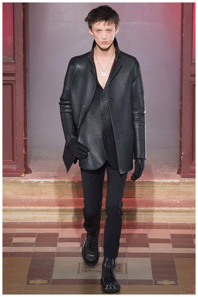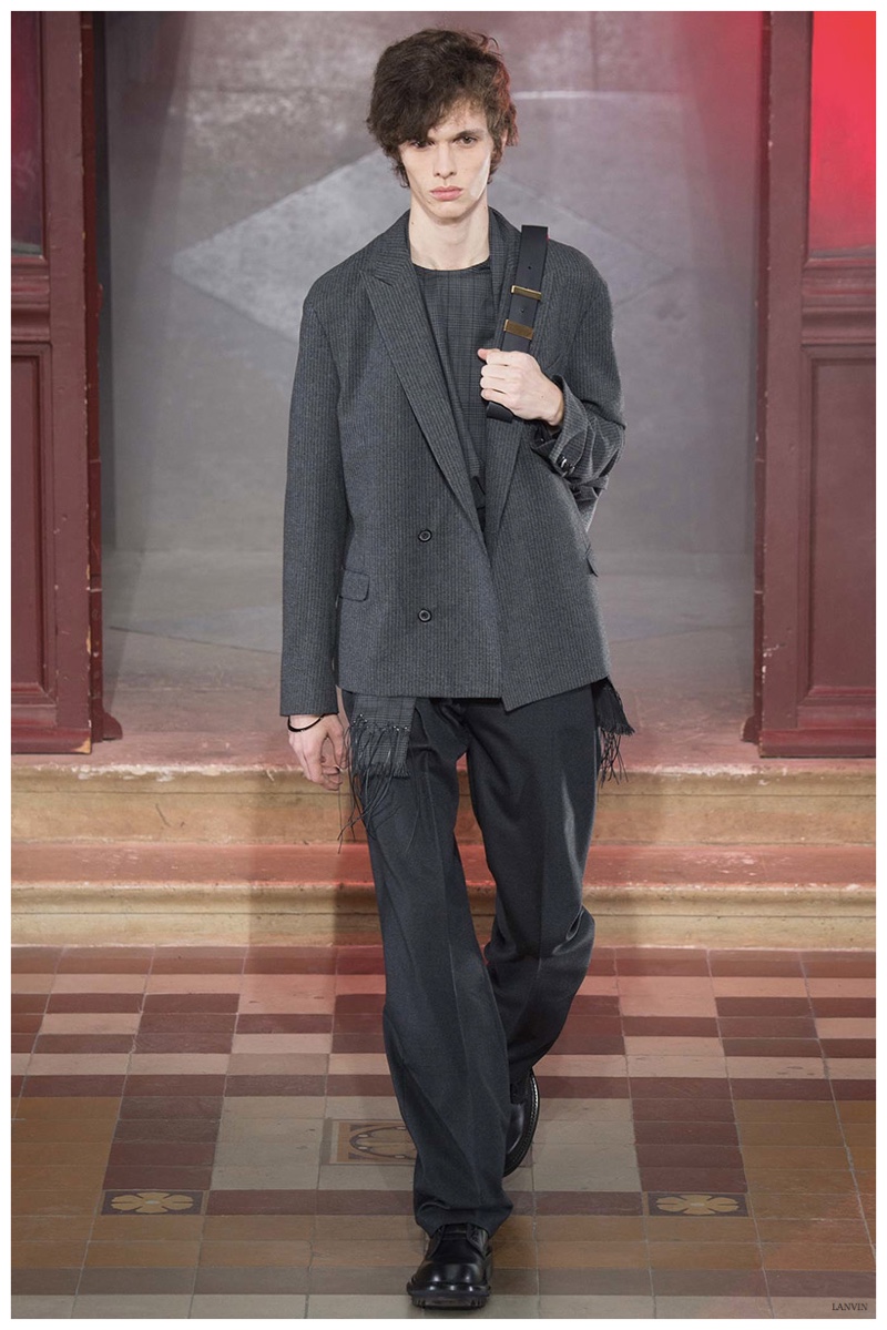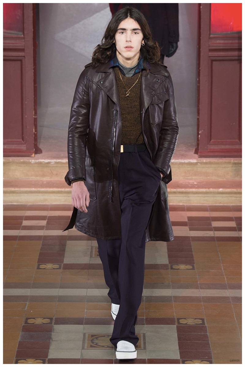 The Lanvin man was dark and brooding for fall. Alber Elbaz and Lucas Ossendrijver continued to play with volume as loose, slouchy, high-waisted trousers moved with great fluidity in contrast to structured blazers and jackets, paired with elongated silhouettes. Instead of offering head to toe ensembles, the collection focused on separates in the same color scheme, mimicking the eclecticism of a man’s daily wardrobe. While the youthful rebellious edge was seen in leather coats and jackets that mixed prints and textures, Lanvin also offered a contemporary simplicity with oversized t-shirts.