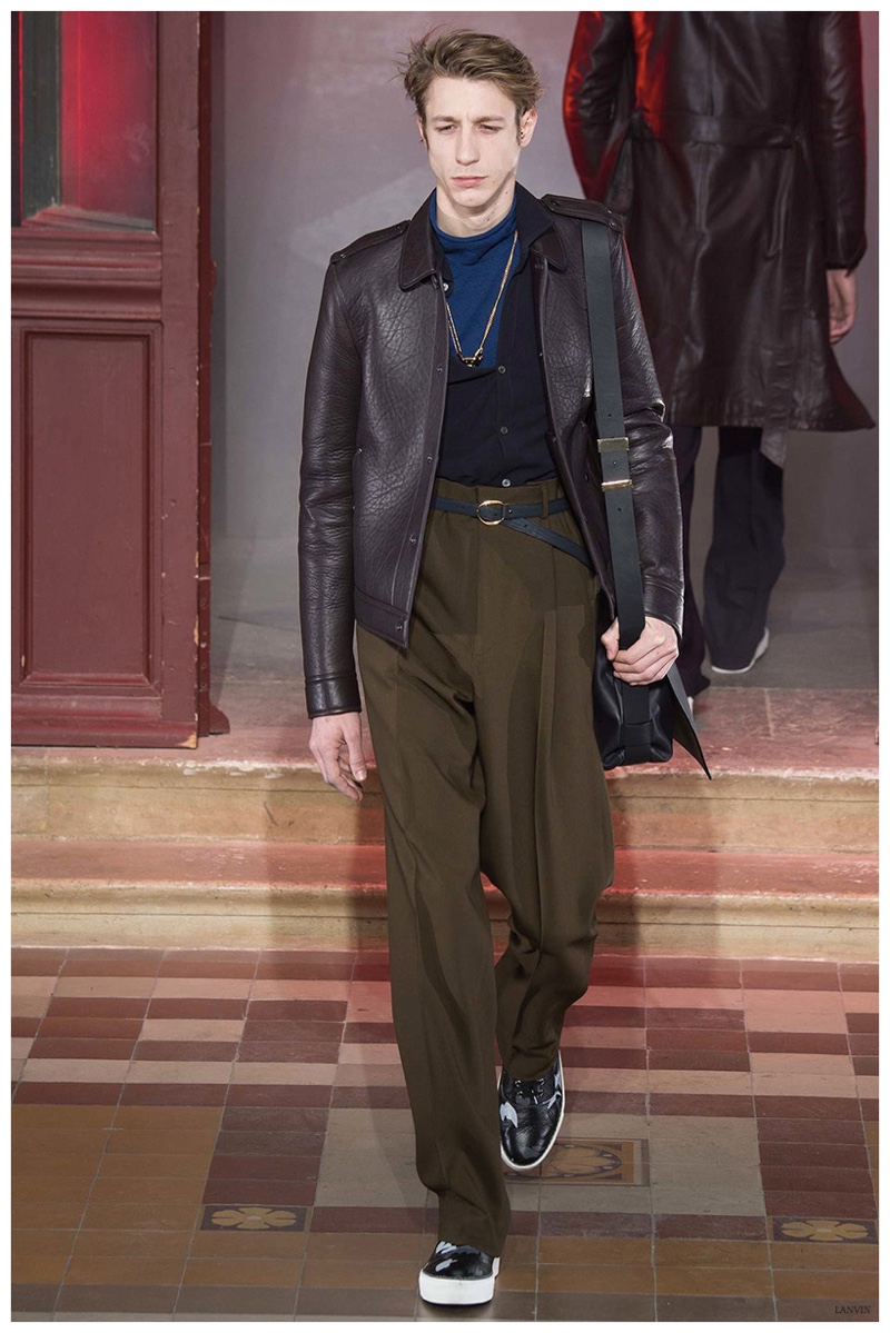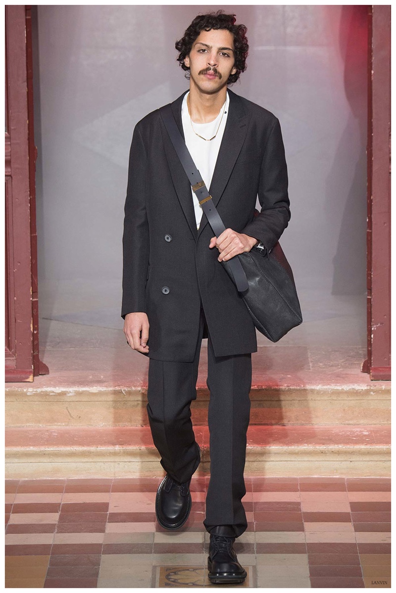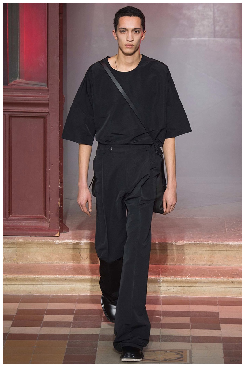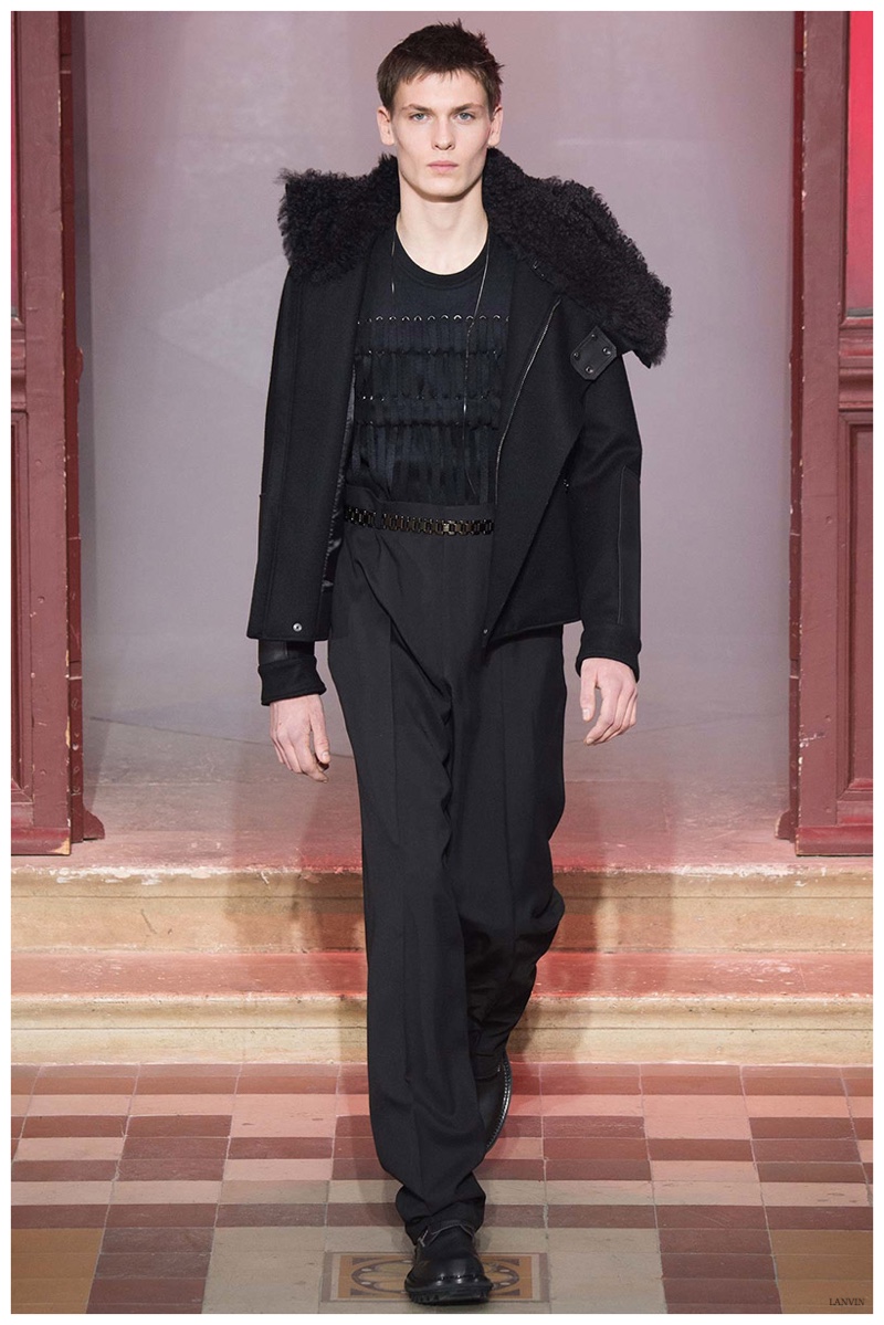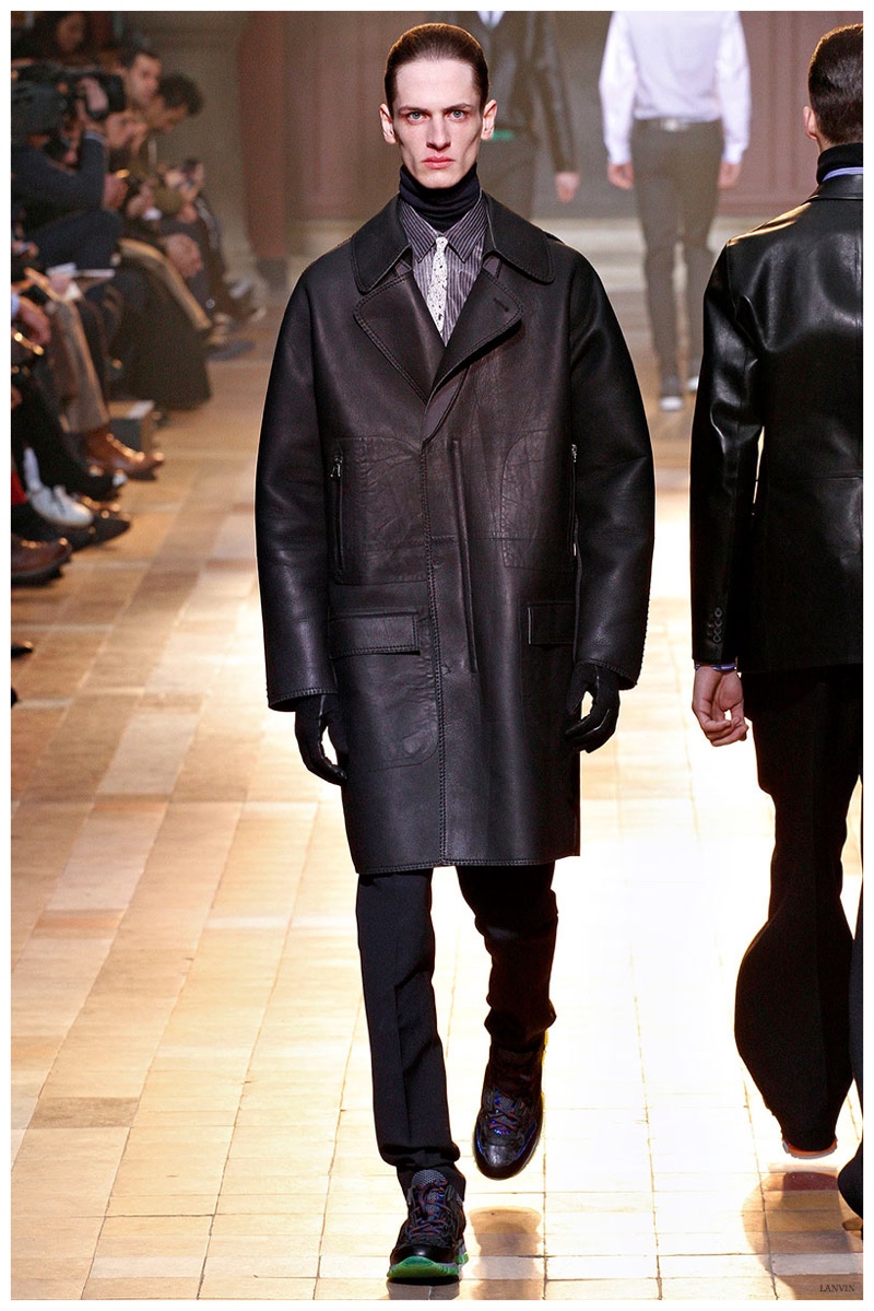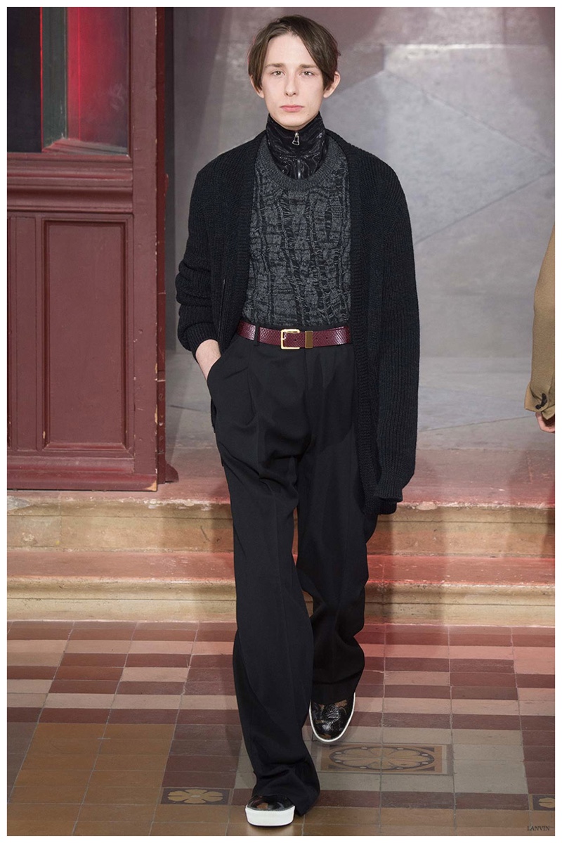 The Lanvin man was dark and brooding for fall. Alber Elbaz and Lucas Ossendrijver continued to play with volume as loose, slouchy, high-waisted trousers moved with great fluidity in contrast to structured blazers and jackets, paired with elongated silhouettes. Instead of offering head to toe ensembles, the collection focused on separates in the same color scheme, mimicking the eclecticism of a man’s daily wardrobe. While the youthful rebellious edge was seen in leather coats and jackets that mixed prints and textures, Lanvin also offered a contemporary simplicity with oversized t-shirts.