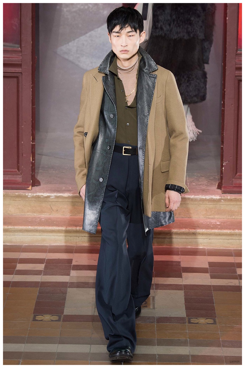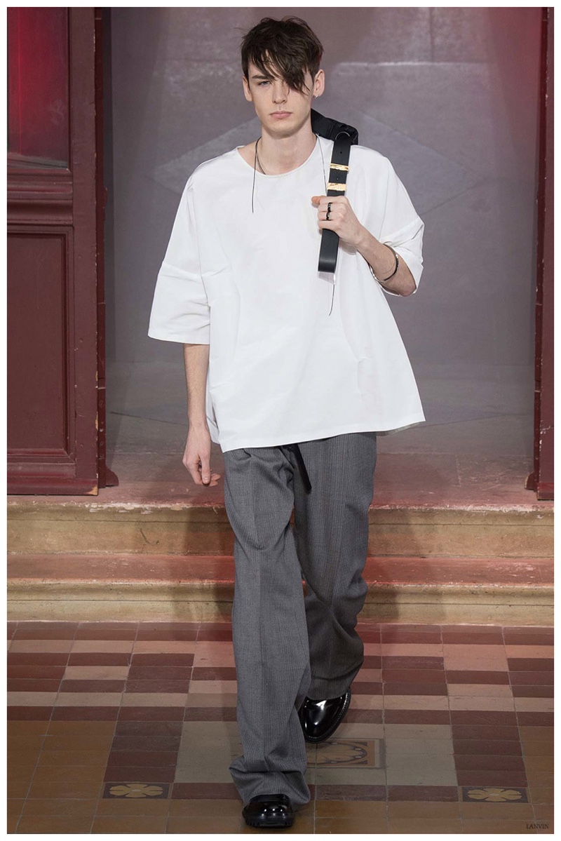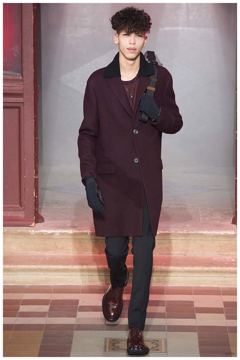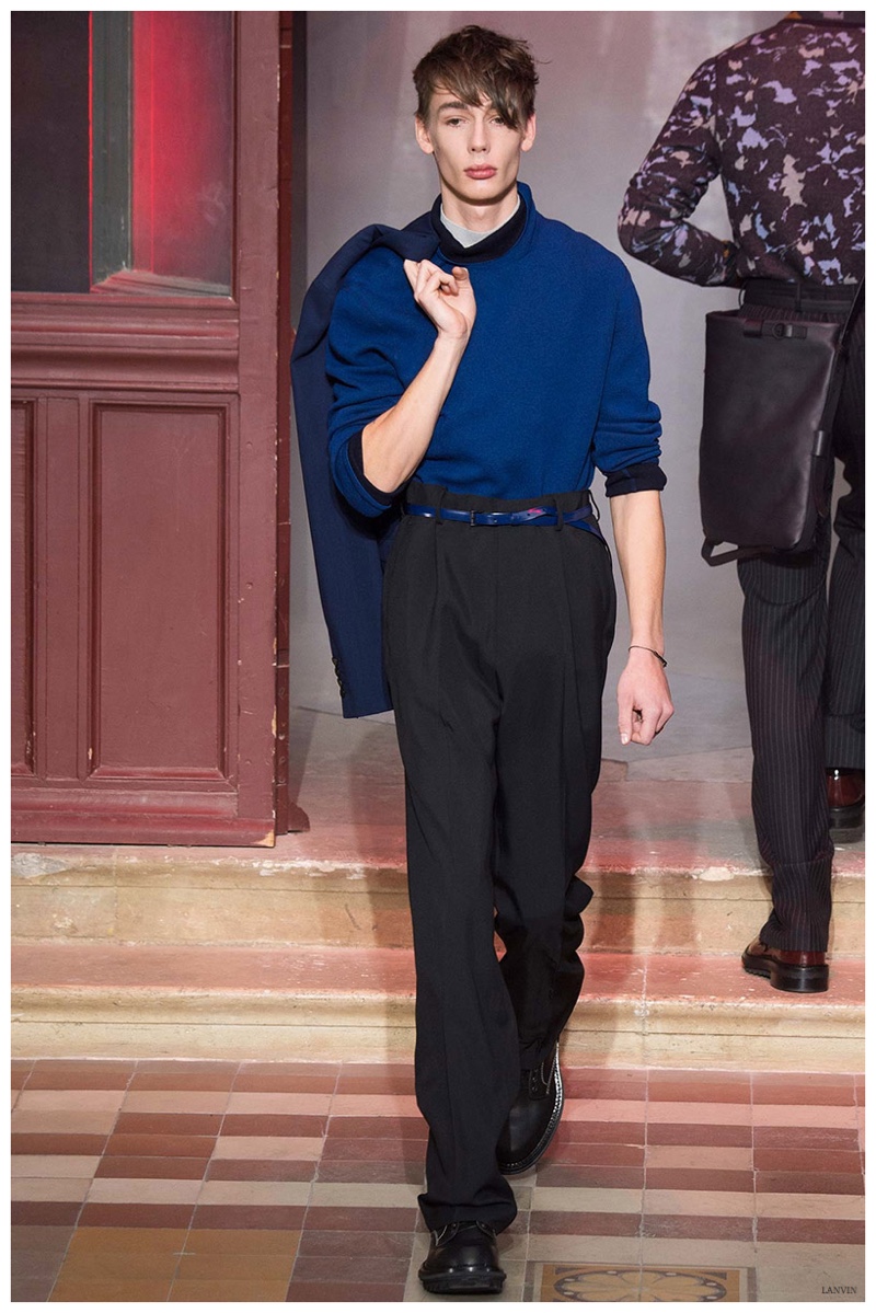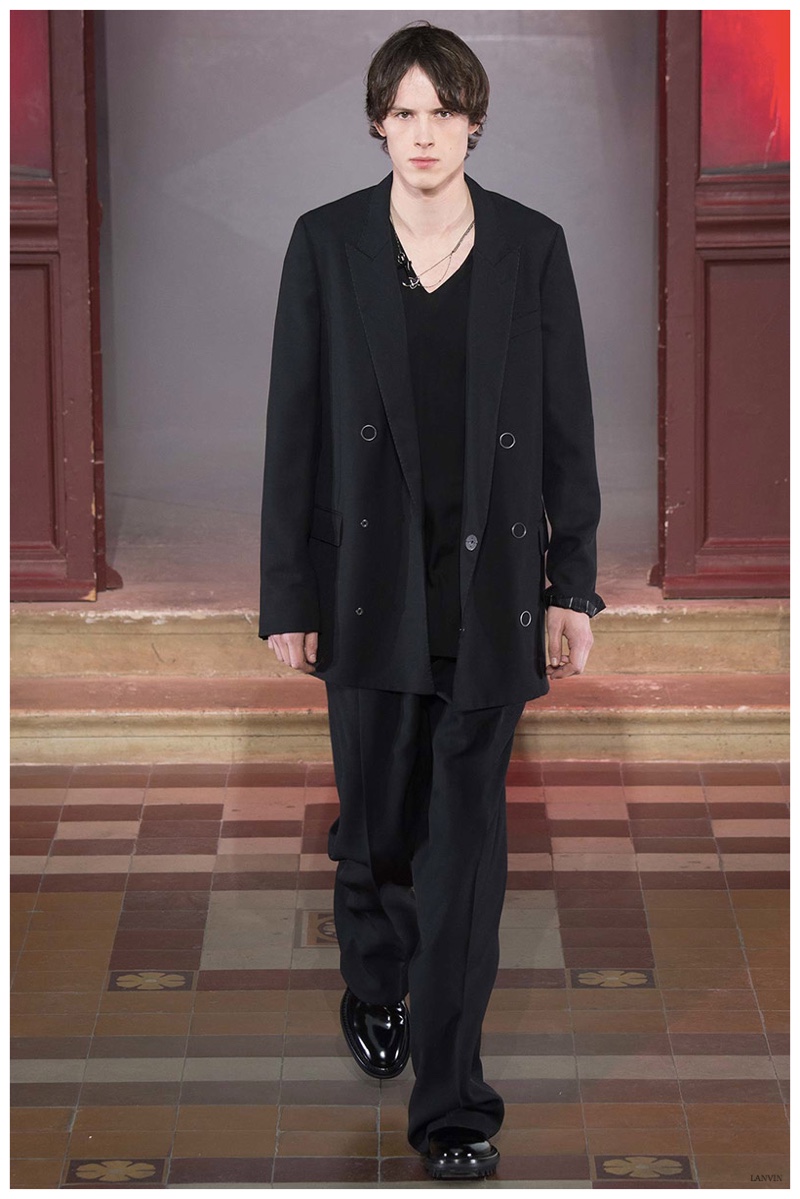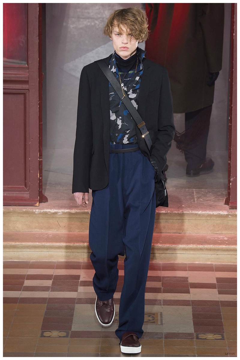 The Lanvin man was dark and brooding for fall. Alber Elbaz and Lucas Ossendrijver continued to play with volume as loose, slouchy, high-waisted trousers moved with great fluidity in contrast to structured blazers and jackets, paired with elongated silhouettes. Instead of offering head to toe ensembles, the collection focused on separates in the same color scheme, mimicking the eclecticism of a man’s daily wardrobe. While the youthful rebellious edge was seen in leather coats and jackets that mixed prints and textures, Lanvin also offered a contemporary simplicity with oversized t-shirts.