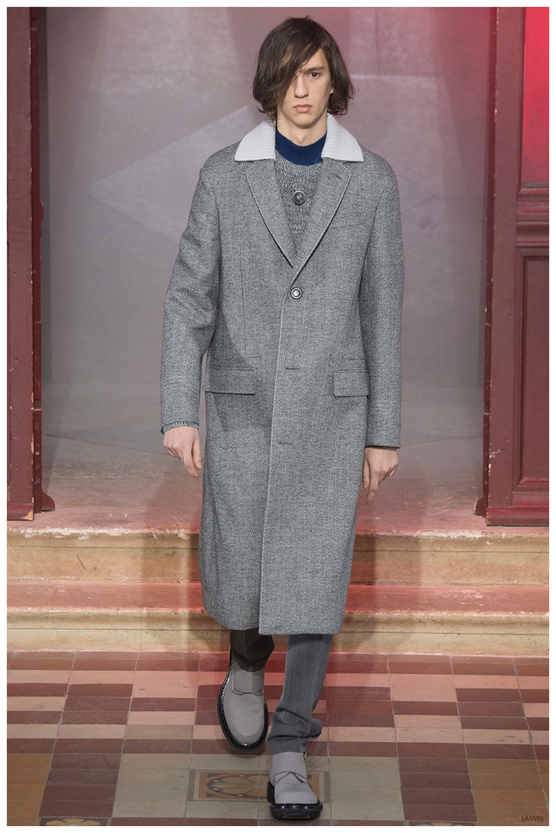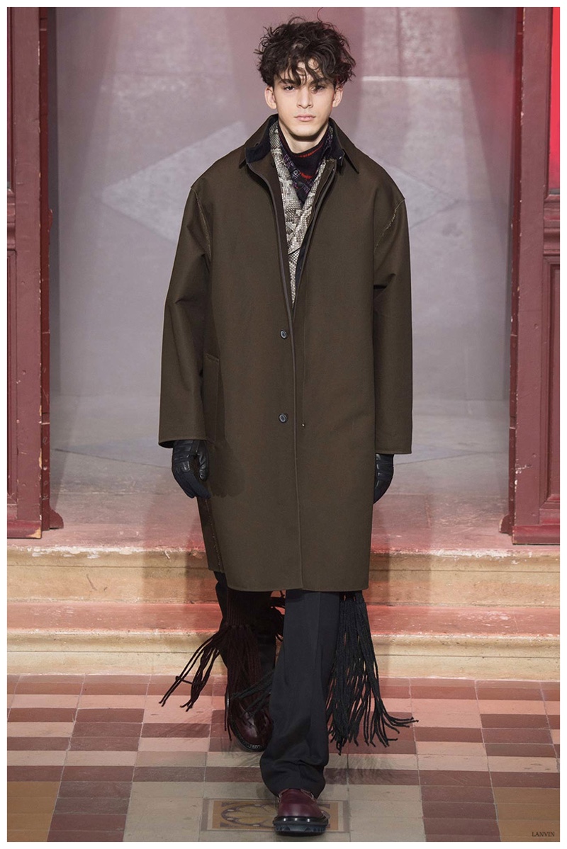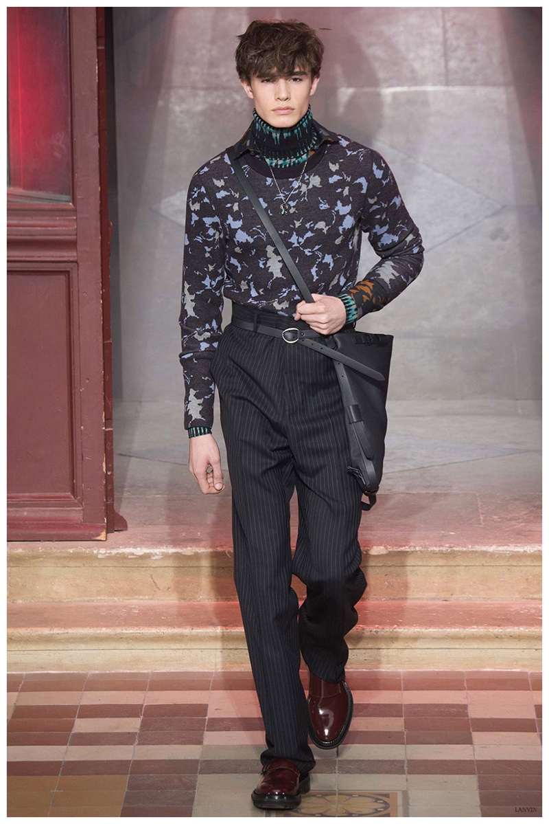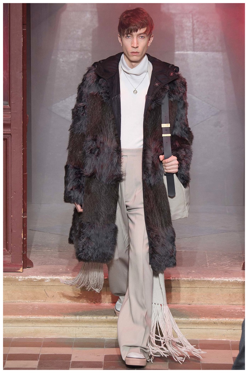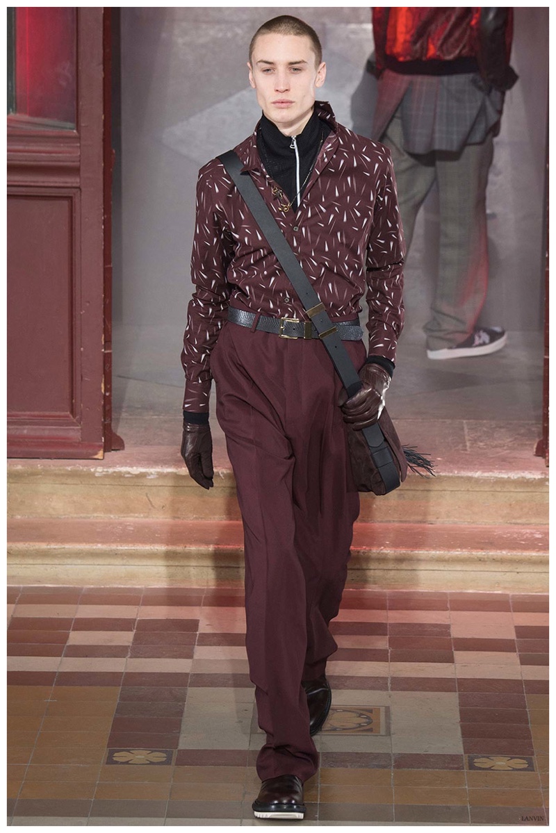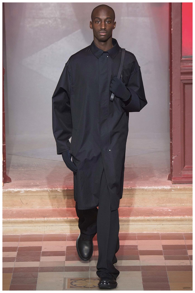 The Lanvin man was dark and brooding for fall. Alber Elbaz and Lucas Ossendrijver continued to play with volume as loose, slouchy, high-waisted trousers moved with great fluidity in contrast to structured blazers and jackets, paired with elongated silhouettes. Instead of offering head to toe ensembles, the collection focused on separates in the same color scheme, mimicking the eclecticism of a man’s daily wardrobe. While the youthful rebellious edge was seen in leather coats and jackets that mixed prints and textures, Lanvin also offered a contemporary simplicity with oversized t-shirts.