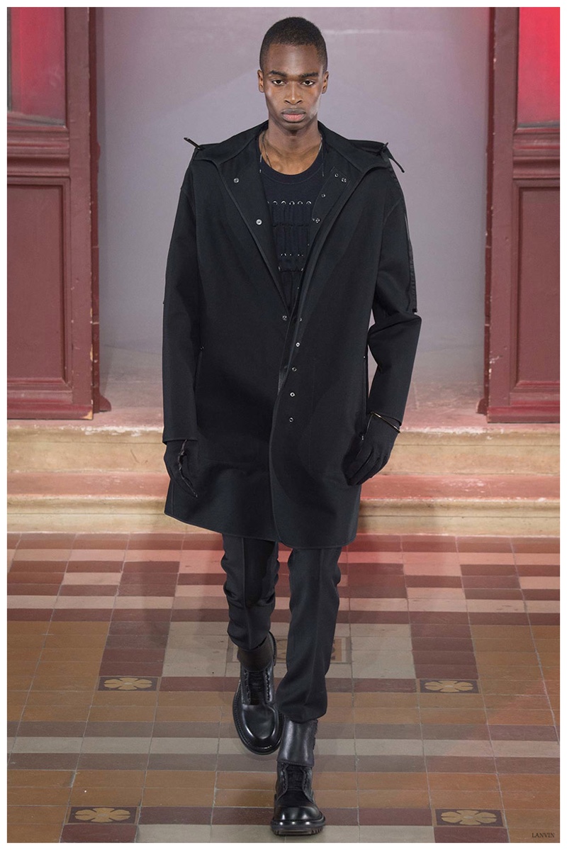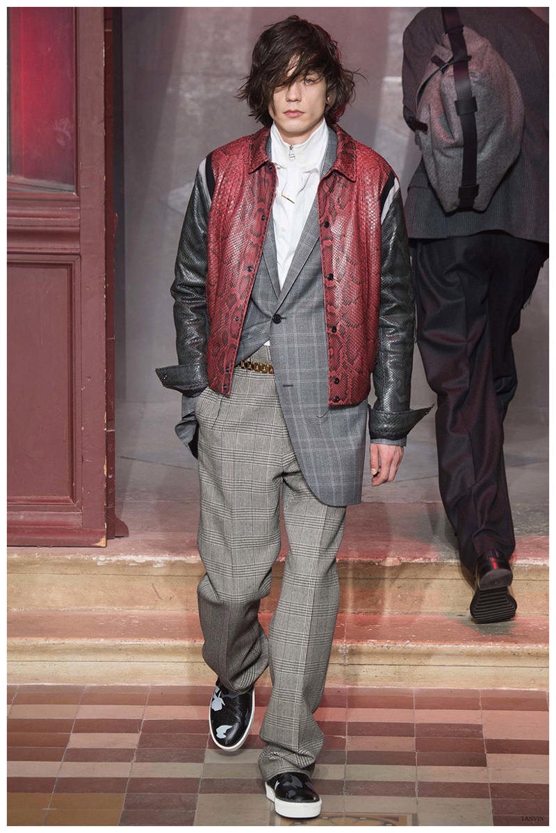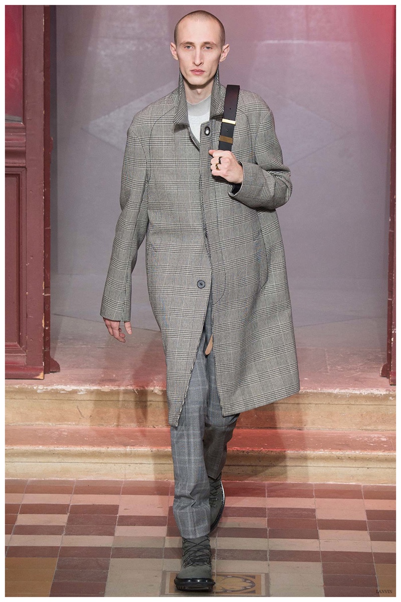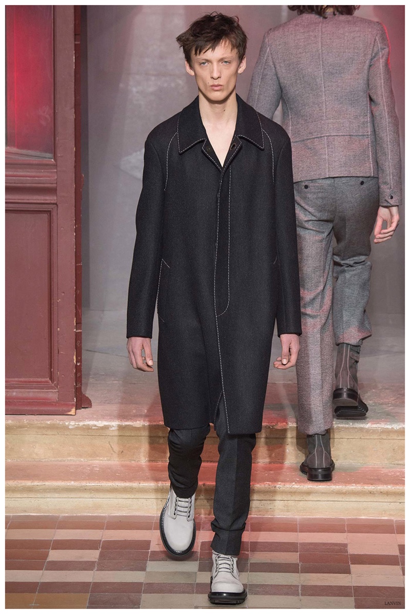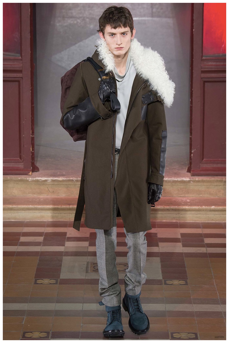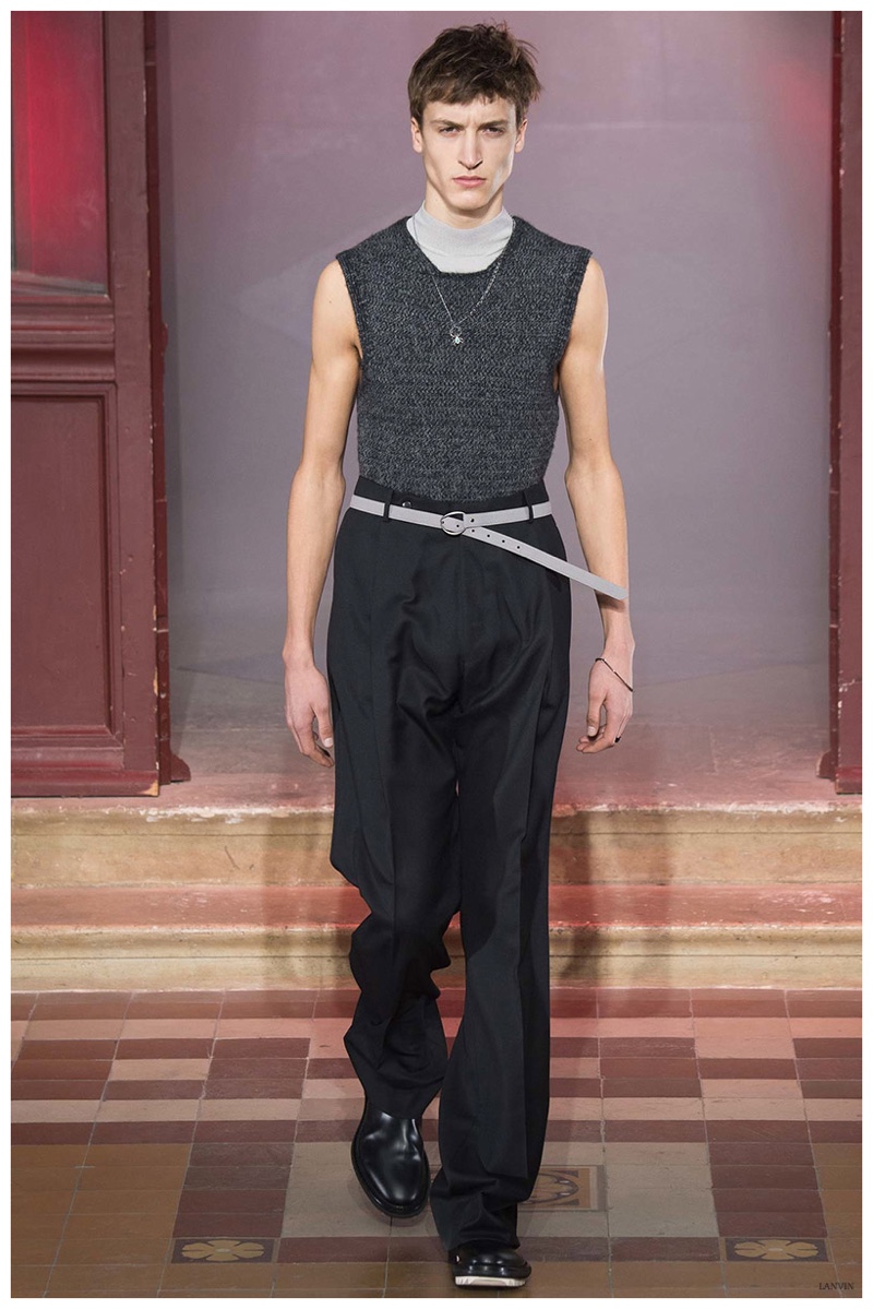 The Lanvin man was dark and brooding for fall. Alber Elbaz and Lucas Ossendrijver continued to play with volume as loose, slouchy, high-waisted trousers moved with great fluidity in contrast to structured blazers and jackets, paired with elongated silhouettes. Instead of offering head to toe ensembles, the collection focused on separates in the same color scheme, mimicking the eclecticism of a man’s daily wardrobe. While the youthful rebellious edge was seen in leather coats and jackets that mixed prints and textures, Lanvin also offered a contemporary simplicity with oversized t-shirts.