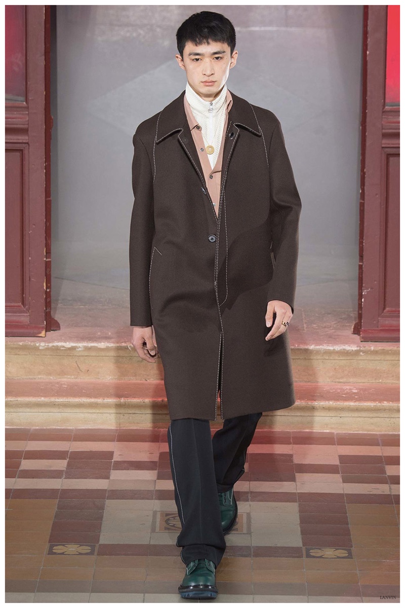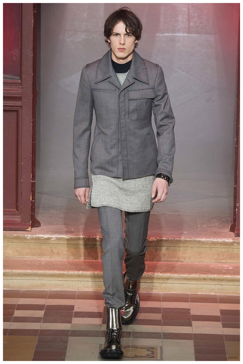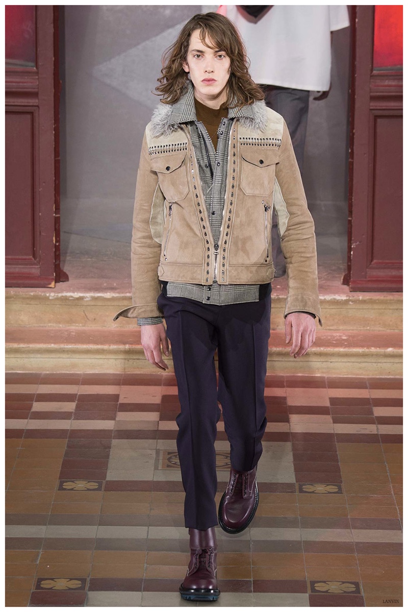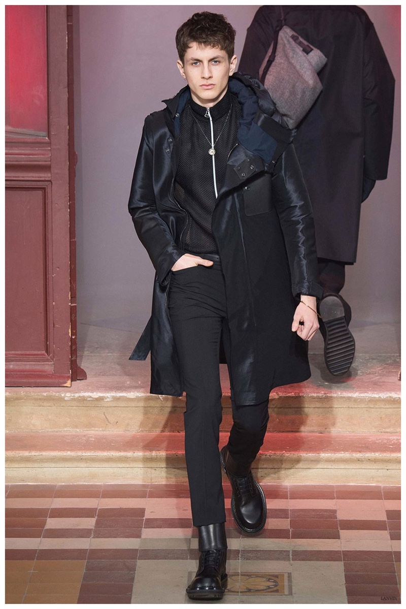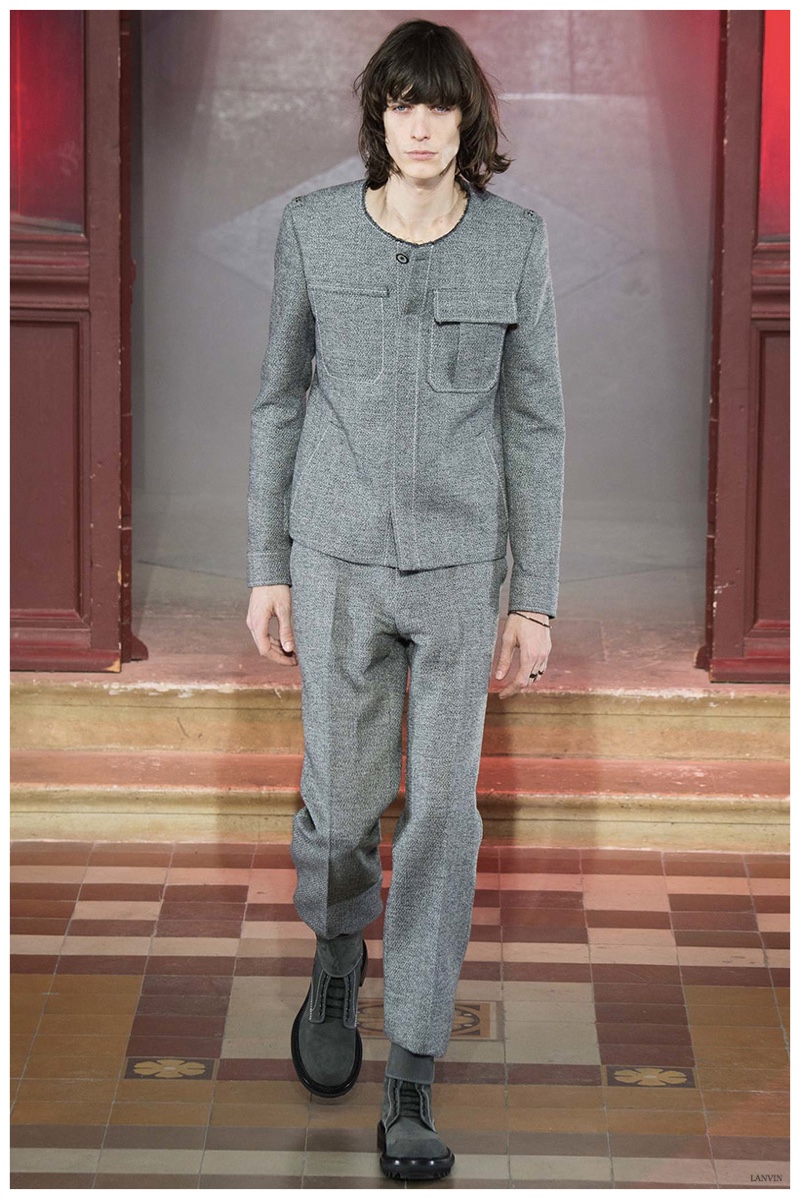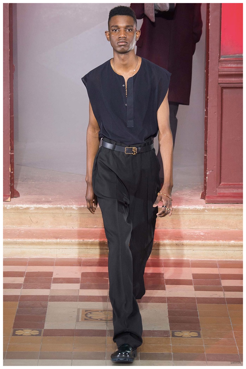 The Lanvin man was dark and brooding for fall. Alber Elbaz and Lucas Ossendrijver continued to play with volume as loose, slouchy, high-waisted trousers moved with great fluidity in contrast to structured blazers and jackets, paired with elongated silhouettes. Instead of offering head to toe ensembles, the collection focused on separates in the same color scheme, mimicking the eclecticism of a man’s daily wardrobe. While the youthful rebellious edge was seen in leather coats and jackets that mixed prints and textures, Lanvin also offered a contemporary simplicity with oversized t-shirts.