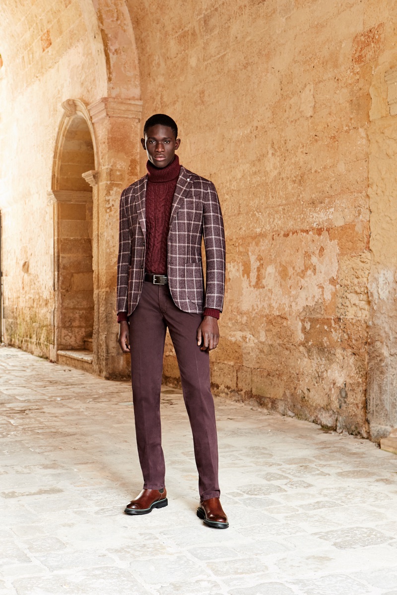 A chic vision, Paco Diouf dons an ensemble in wine-colored hues from L.B.M. 1911’s fall-winter 2019 collection.