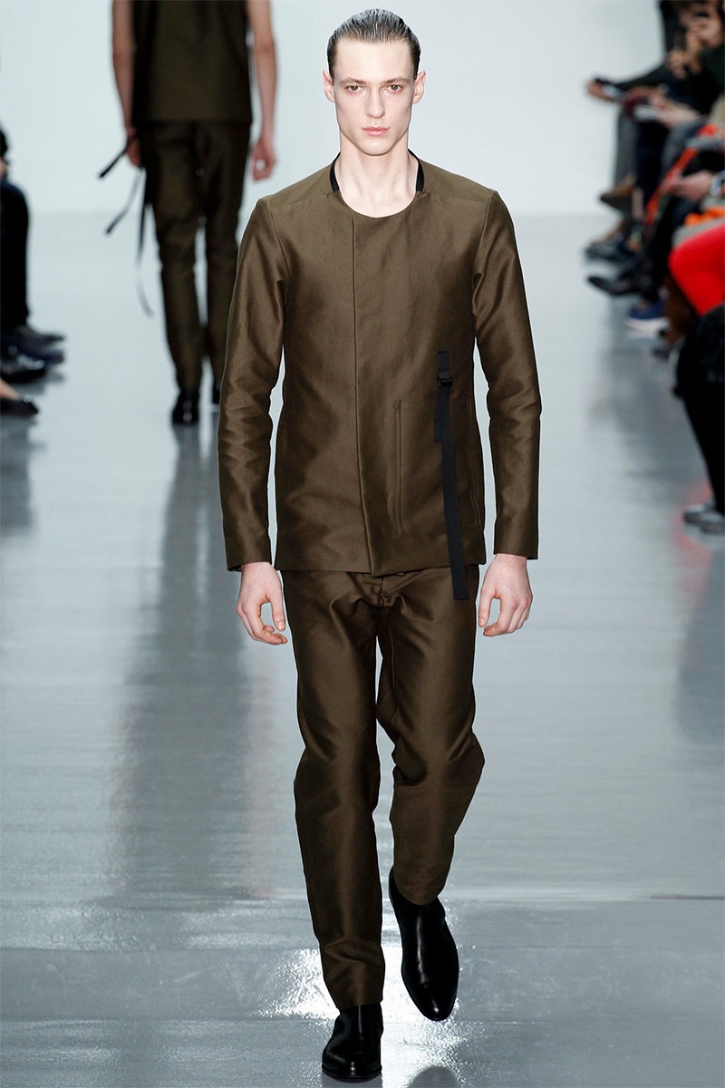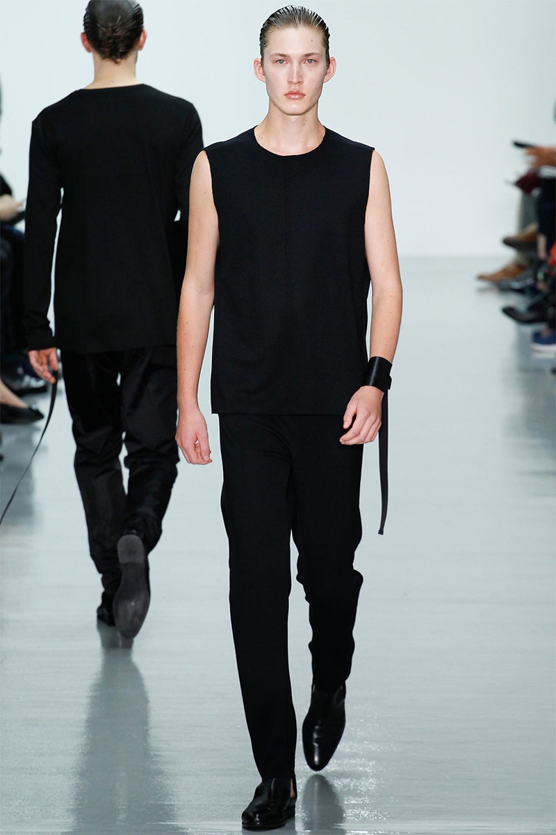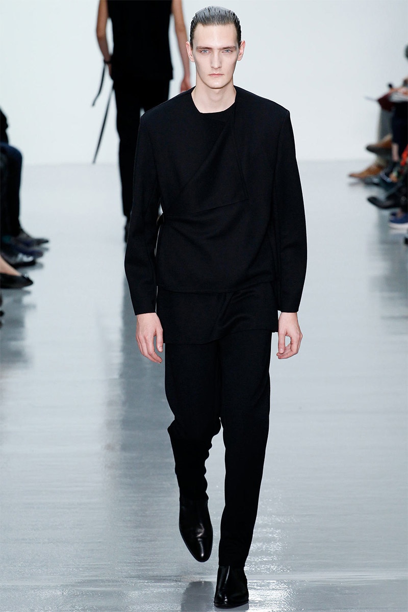 Lee Roach Fall/Winter 2014–A slick minimal aptitude defined the latest collection from designer Lee Roach during London Collections: Men. The young designer opted for a simple color palette to dress a clean modern uniform. Mixing lean silhouettes with controlled draping, twenty-two solid looks provided a glimpse into the well-tailored man who embraces modern lines with an androgynous attitude.