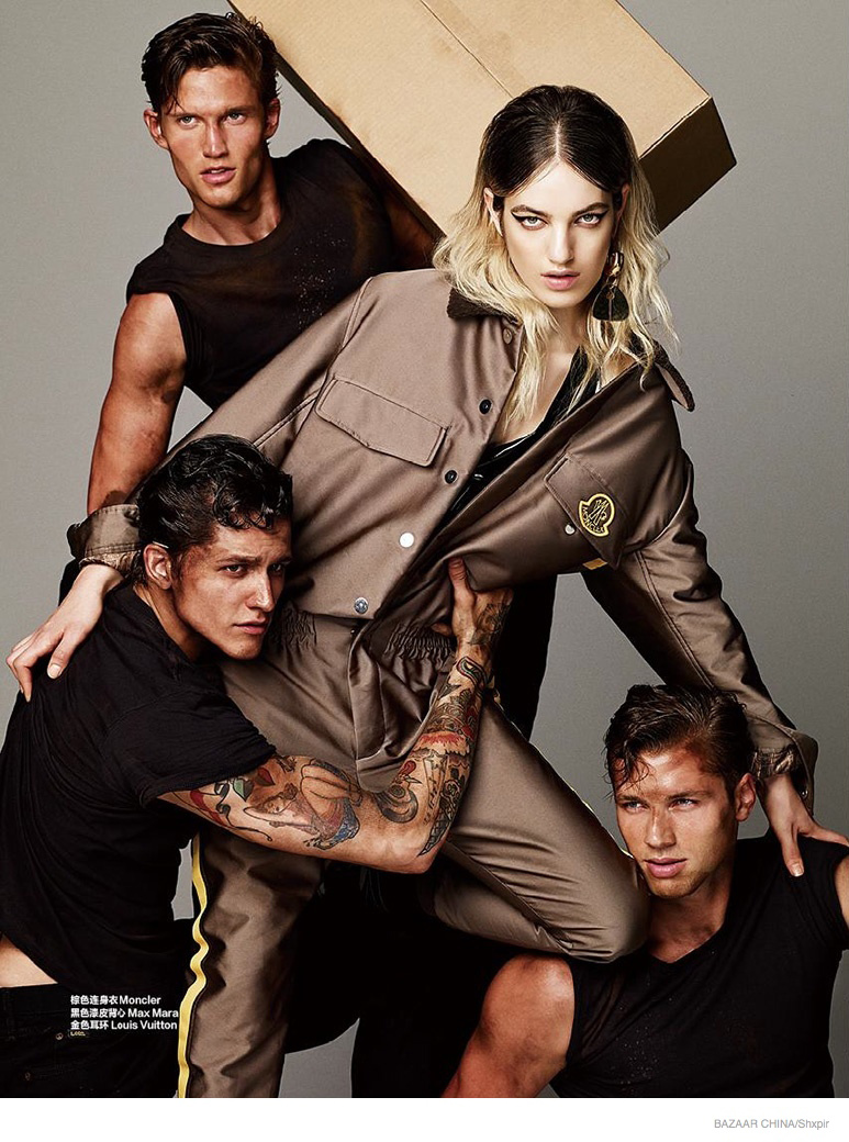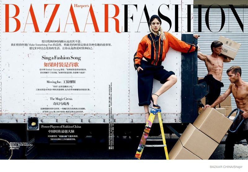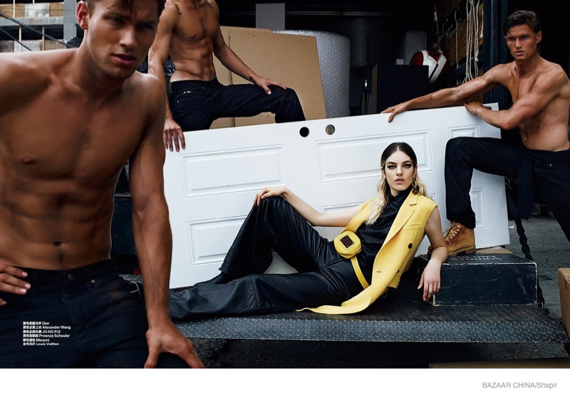 Model Movers-Photographed by Shxpir for the October 2014 edition of Harper’s Bazaar China, Leebo Freeman, Jules Hamilton and Kacey Carrig are model movers. Joined by model Naomi Preizler, the trio visit a storage unit to unload materials. Working up a sweat, Leebo, Jules and Kacey are captured in minimal black outfits and classic work boots styled by Ada Kokosar. / Makeup by Morgane Martini. Hair by Marco Braca.