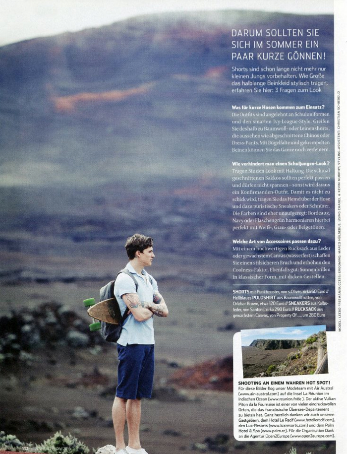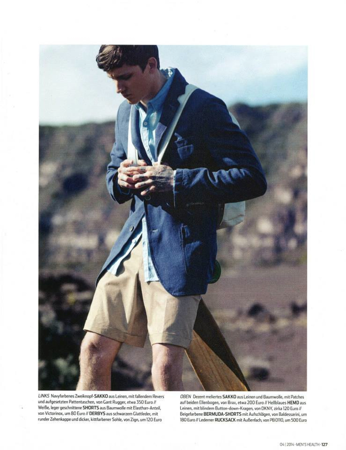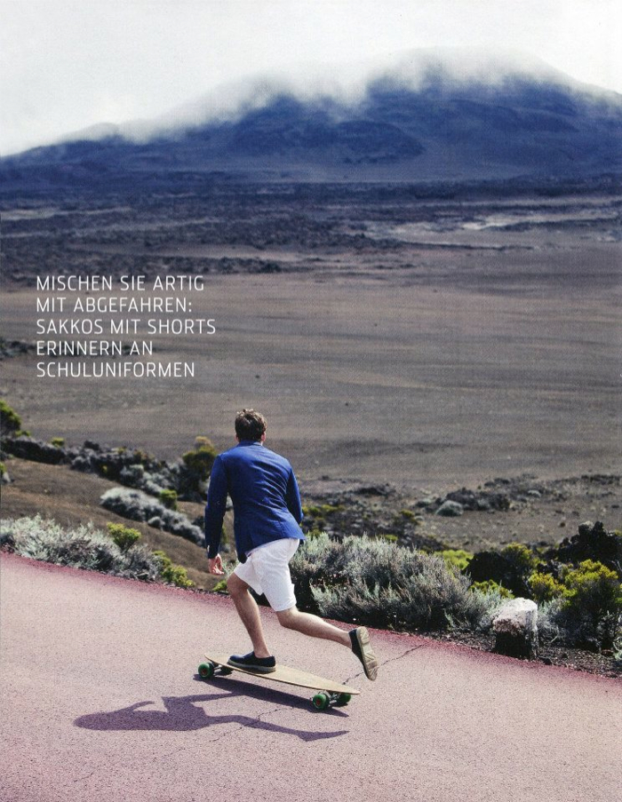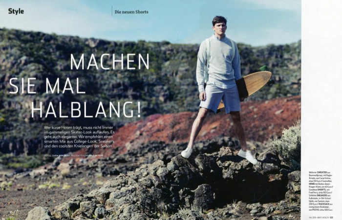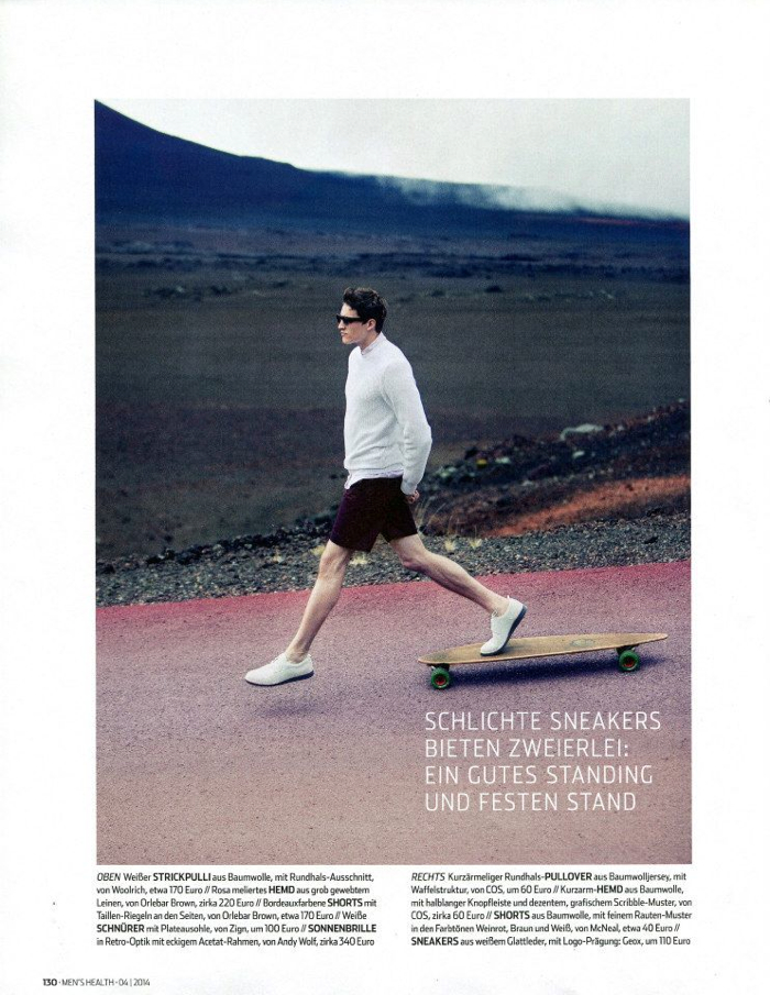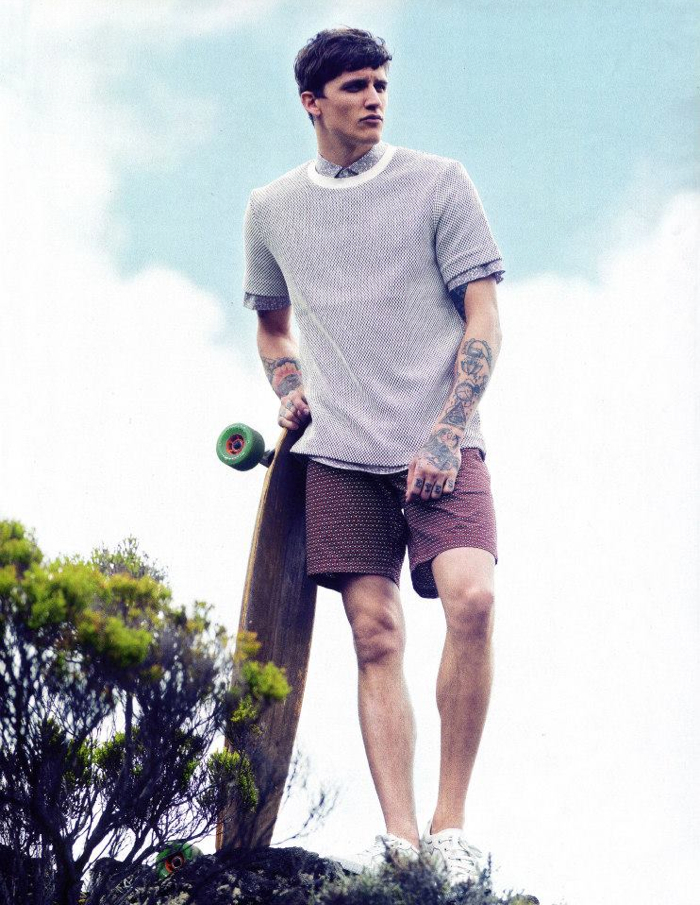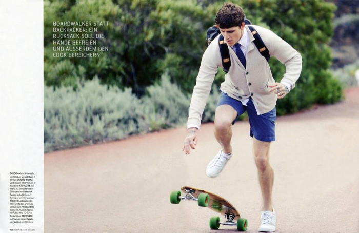 Skater Chic–Following their spread together for Men’s Health Best Fashion, photographer Sven Baenziger and model Leebo Freeman reunite for a story in Men’s Health Germany. Leaving the pool behind him, Leebo reaches new heights as he takes his longboard and hits the road. Styled by Yilmaz Aktepe once more, Leebo is outfitted in relaxed separates as he models current fashions from labels that include GANT Rugger and DKNY.
