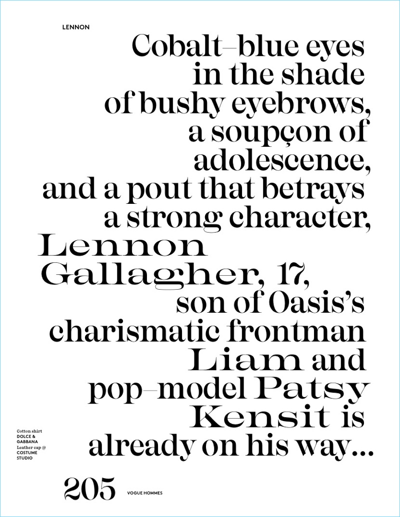 The days of the traditional model continue to fade as the trend of the celebrity child picks up momentum. The latest fresh face is none other than Lennon Gallagher. The 17-year-old model is the son of ex-Oasis frontman, Liam Gallagher. Starring in an editorial for the spring-summer 2017 issue of Vogue Hommes Paris, Gallagher connects with fashion photographer, David Sims. Sporting oversized fashions, Lennon wears relaxed tailoring and graphic pieces. Stylist Katie Grand pulls together the latest from brands such as Givenchy, Balenciaga, and Giorgio Armani.