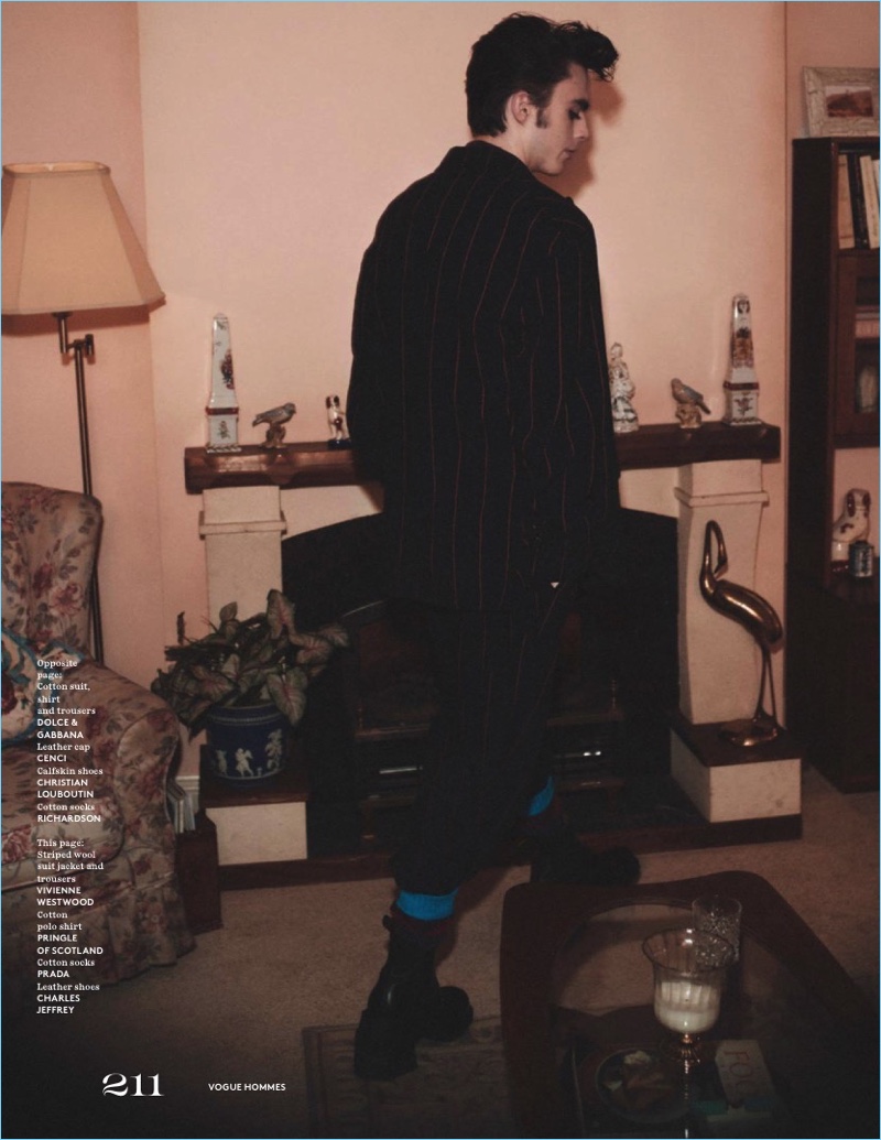PinLennon Gallagher wears a seersucker jacket and trousers by Giorgio Armani. The young model also sports a Balenciaga shirt with Bottega Veneta lace-ups.