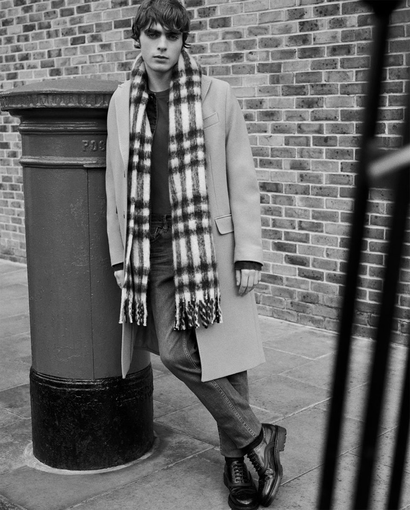 Zara Man travels to London for its latest editorial. Focusing on winter coats, the Spanish brand meets up with Lennon Gallagher. The British model dons classic styles with modern details. Captured in-studio and in the streets of London, Lennon inspires in coats that balance an everyday ease with a fashionable attitude. Lenon sports everything from the double-breasted coat and peacoat to the duffle coat.