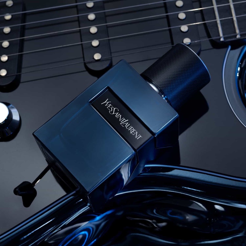 The YSL ad reveals a contrast: Kravitz surrenders to the rhythm with his guitar in one setting and his piercing gaze in another. Blue tones dominate, mirroring the new metallic blue glass bottle of Y Elixir.