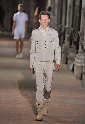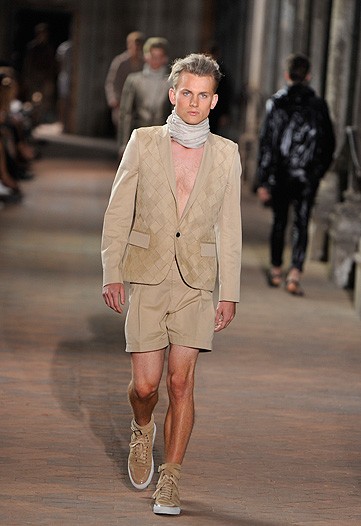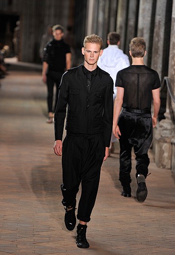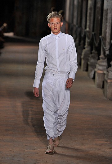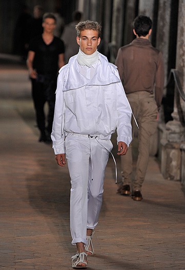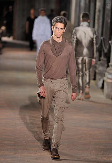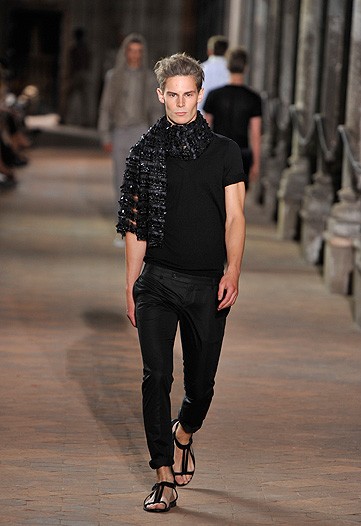 Les Hommes’ might have turned the dial down on their use of beads in their latest collection, but that does not mean that it’s any less glamorous. The spring collection is like a dreamy caravan of gold that is quickly approaching. Heavy on the use of satin and suede, it’s shaping up to be a rather expensive spring for Les Hommes. The luxurious satin numbers at times see overindulgent, but they are so perfectly matched with slouchy suede boots and sandals that bear just the right amount of strap. Honing in on monochromatic numbers of black, white and brown, Les Hommes’ flowing silhouettes perfectly accent the male form, often resulting in fabric meticulously pinched in all the right places to craft a stunning pair of billowing trousers. Finally, if satin, silk and suede are not lavish enough, Les Homme’s spring collection is deemed complete with a hint of sparkly glitz in the form of an exuberant beaded pants number.