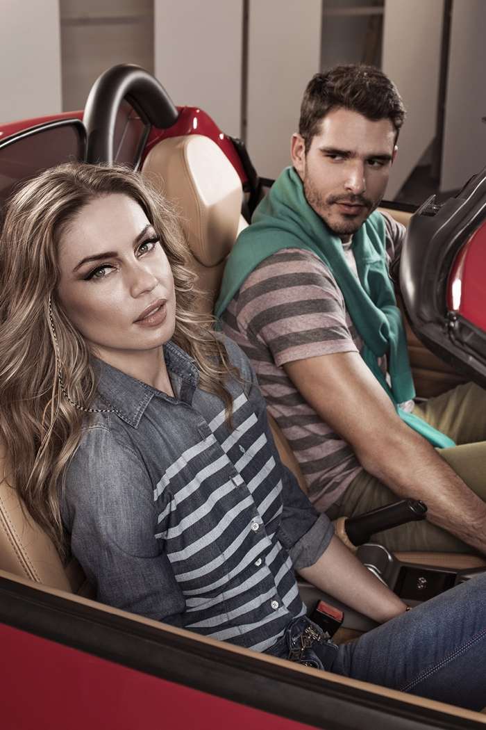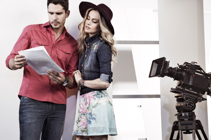 Base Winter 2014 Campaign–Models Leo Peixoto and Patricia Beck come together to star in Base’s winter 2014 campaign, lensed by photographer Eduardo Rezende. Stepping into the roles of actors, the pair are captured behind the scenes, wearing casual fashions pulled together by stylist Raphael Mendonça. / Grooming by Rodrigo Costa. Set design by Felipe Tadeu. Production by Mangaba Produções.