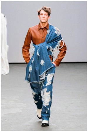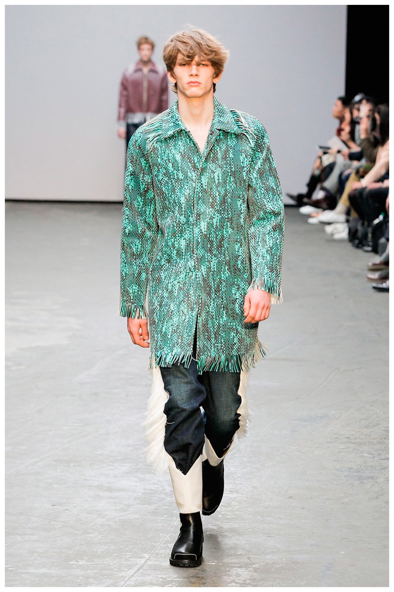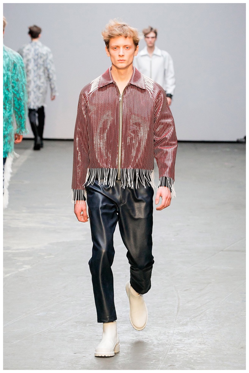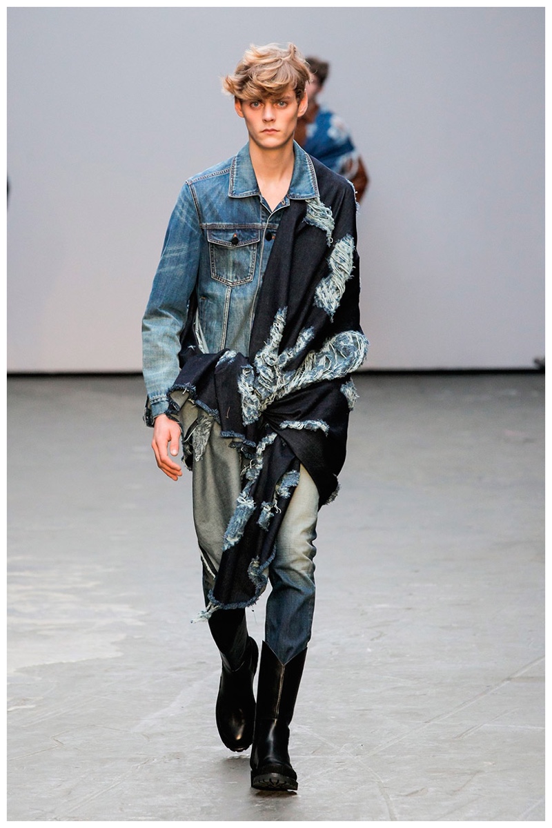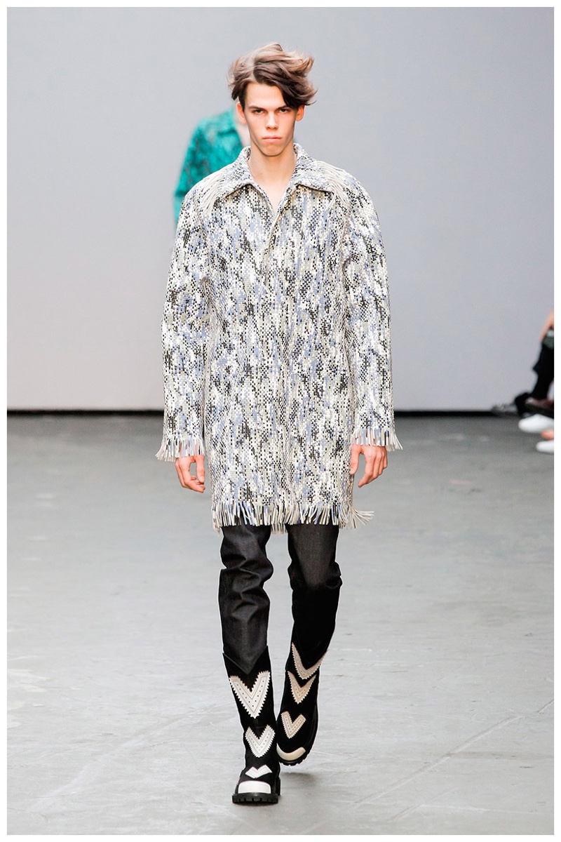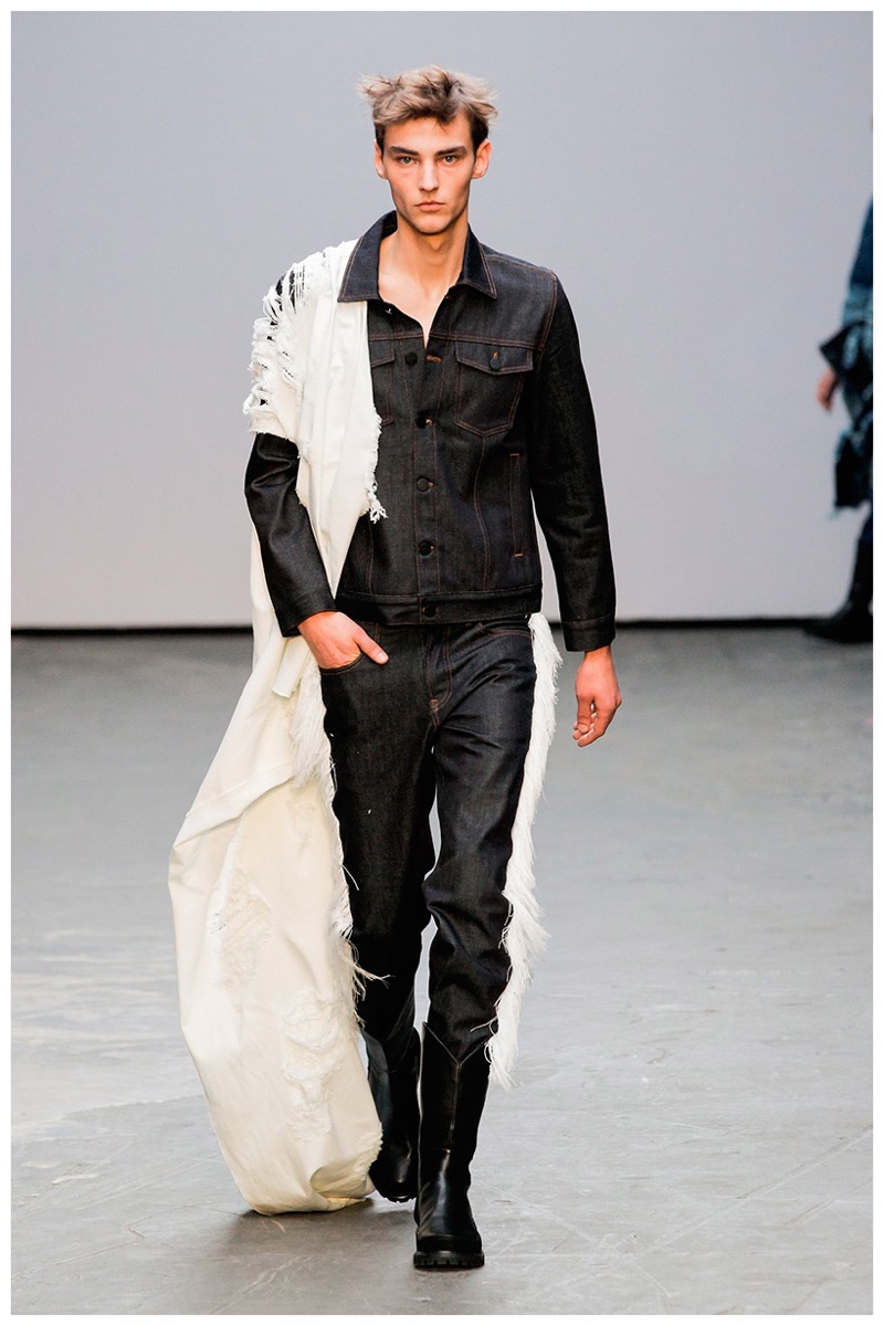 Offering a fresh take on the western motif, Xander Zhou kicked off the season with denim on denim, but didn’t end there. Joining iconic denim staples such as the the denim jacket and ripped denim jeans were embellished, long coats, fringed outerwear, brown leather shorts and color blocked separates.