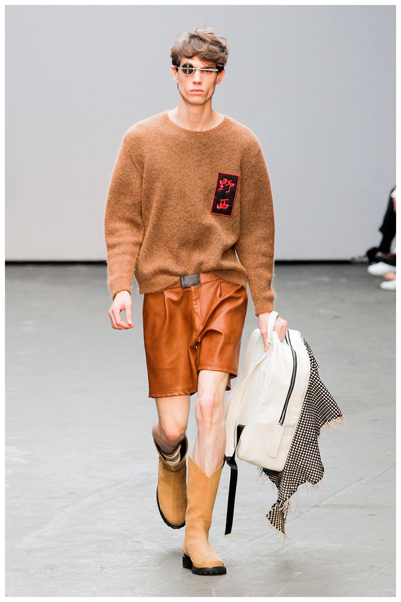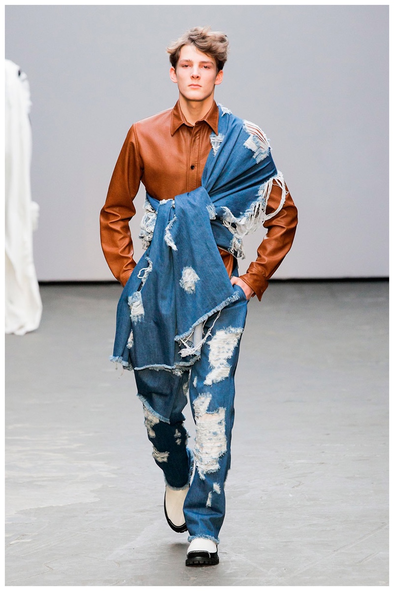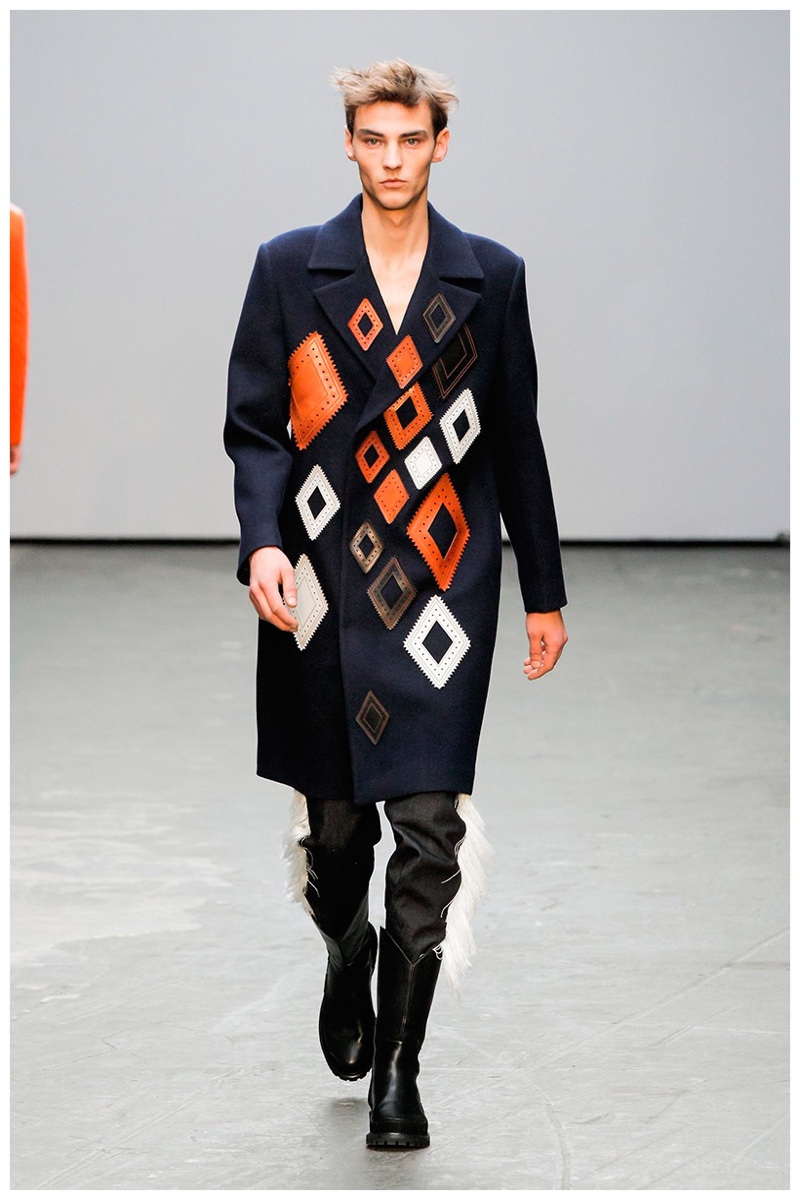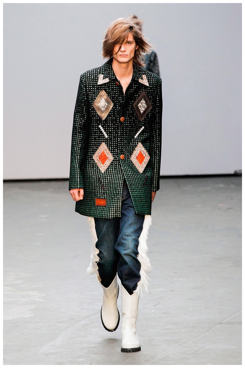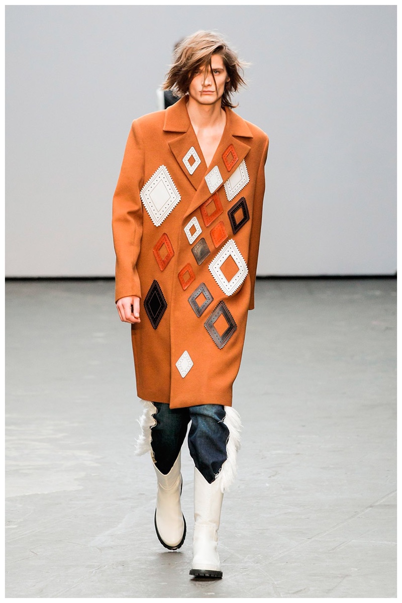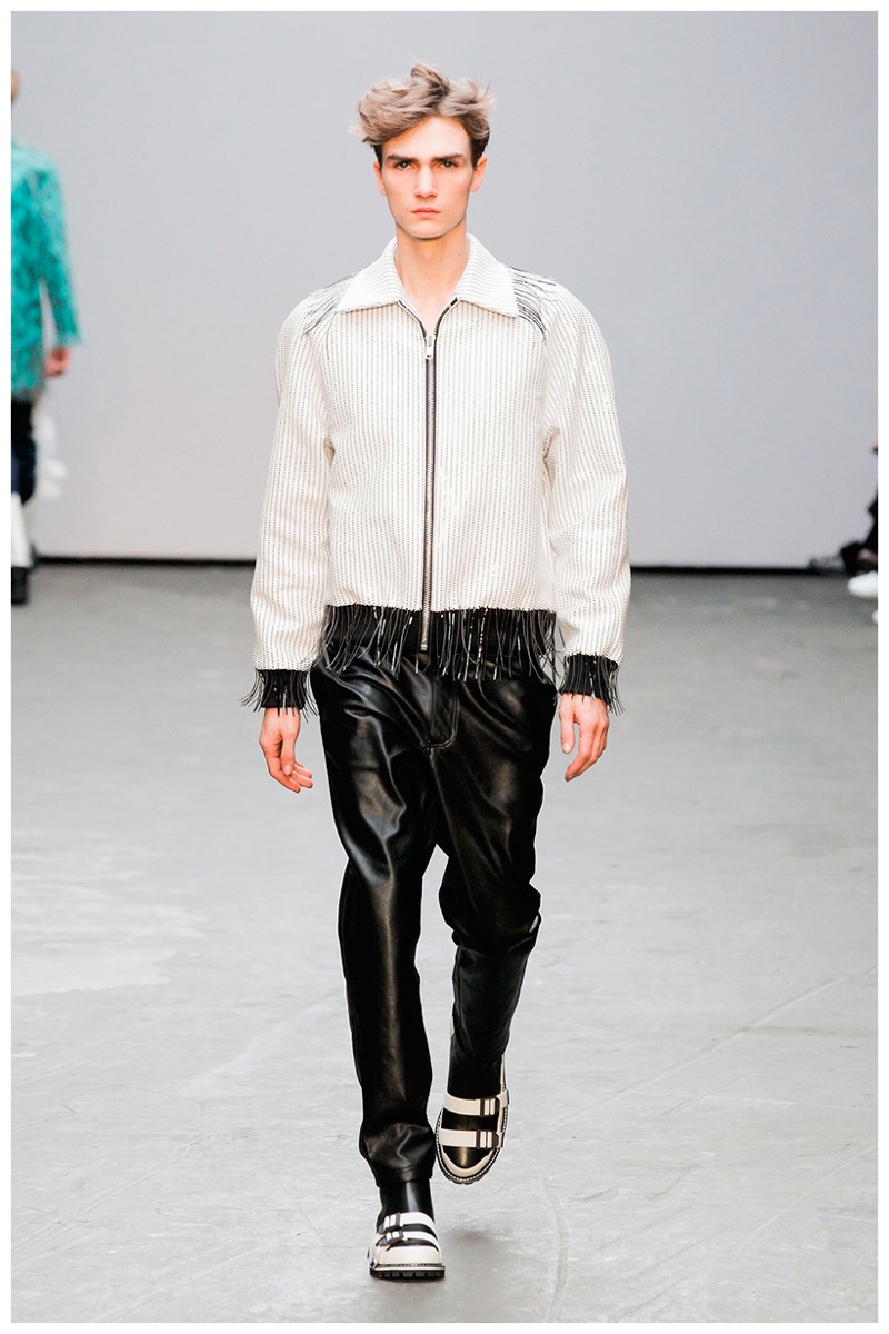 Offering a fresh take on the western motif, Xander Zhou kicked off the season with denim on denim, but didn’t end there. Joining iconic denim staples such as the the denim jacket and ripped denim jeans were embellished, long coats, fringed outerwear, brown leather shorts and color blocked separates.