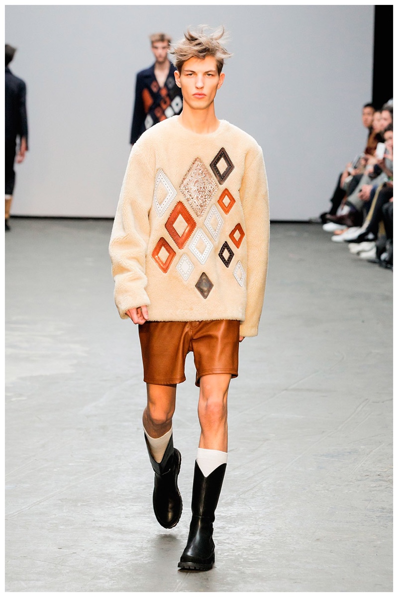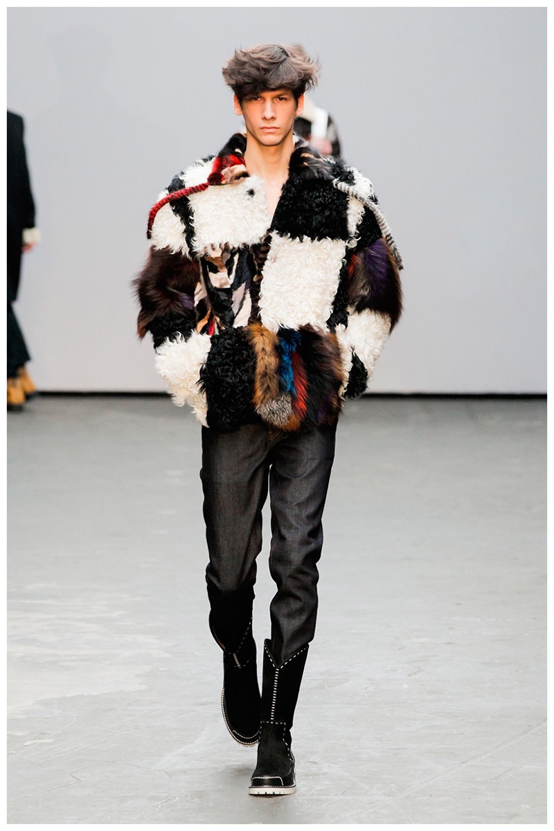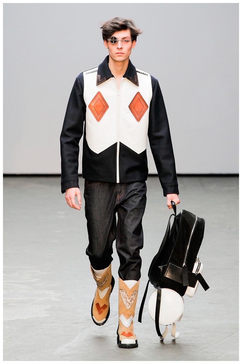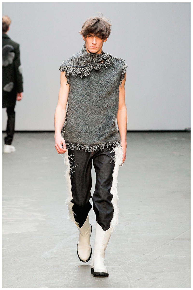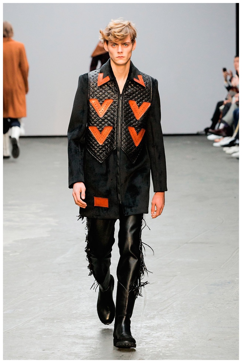 Offering a fresh take on the western motif, Xander Zhou kicked off the season with denim on denim, but didn’t end there. Joining iconic denim staples such as the the denim jacket and ripped denim jeans were embellished, long coats, fringed outerwear, brown leather shorts and color blocked separates.