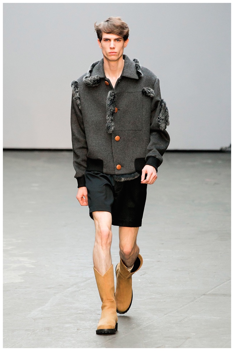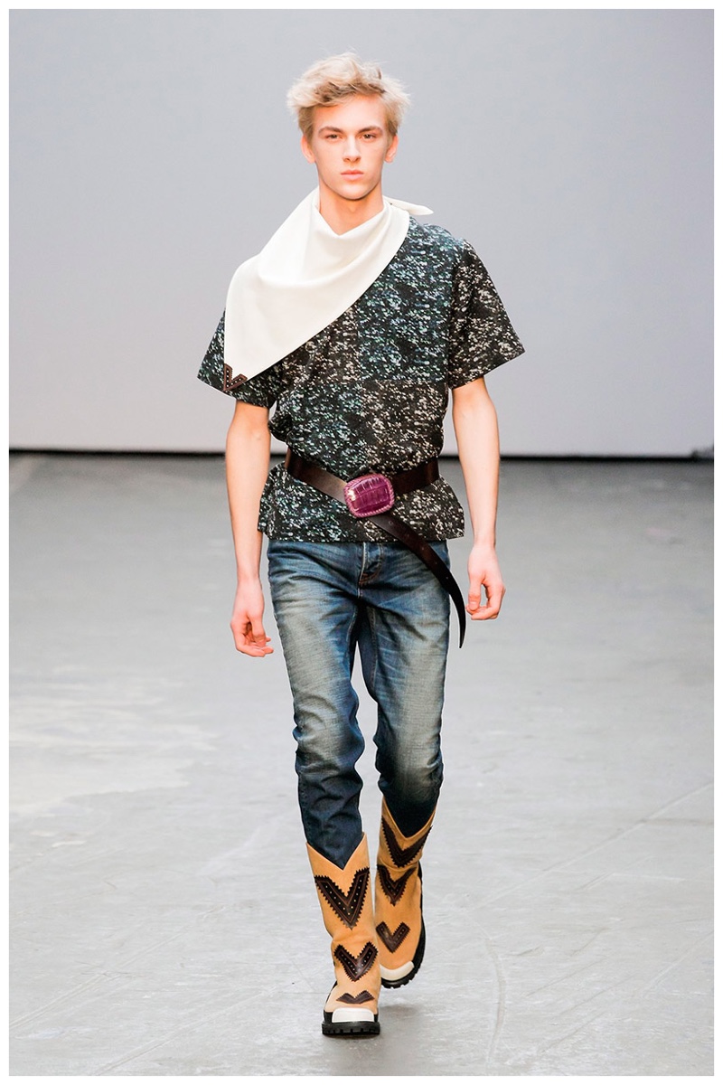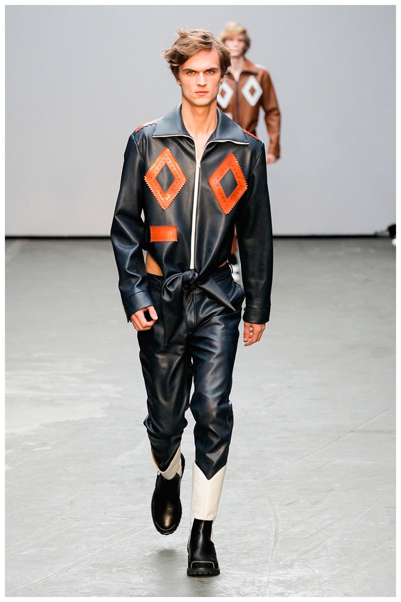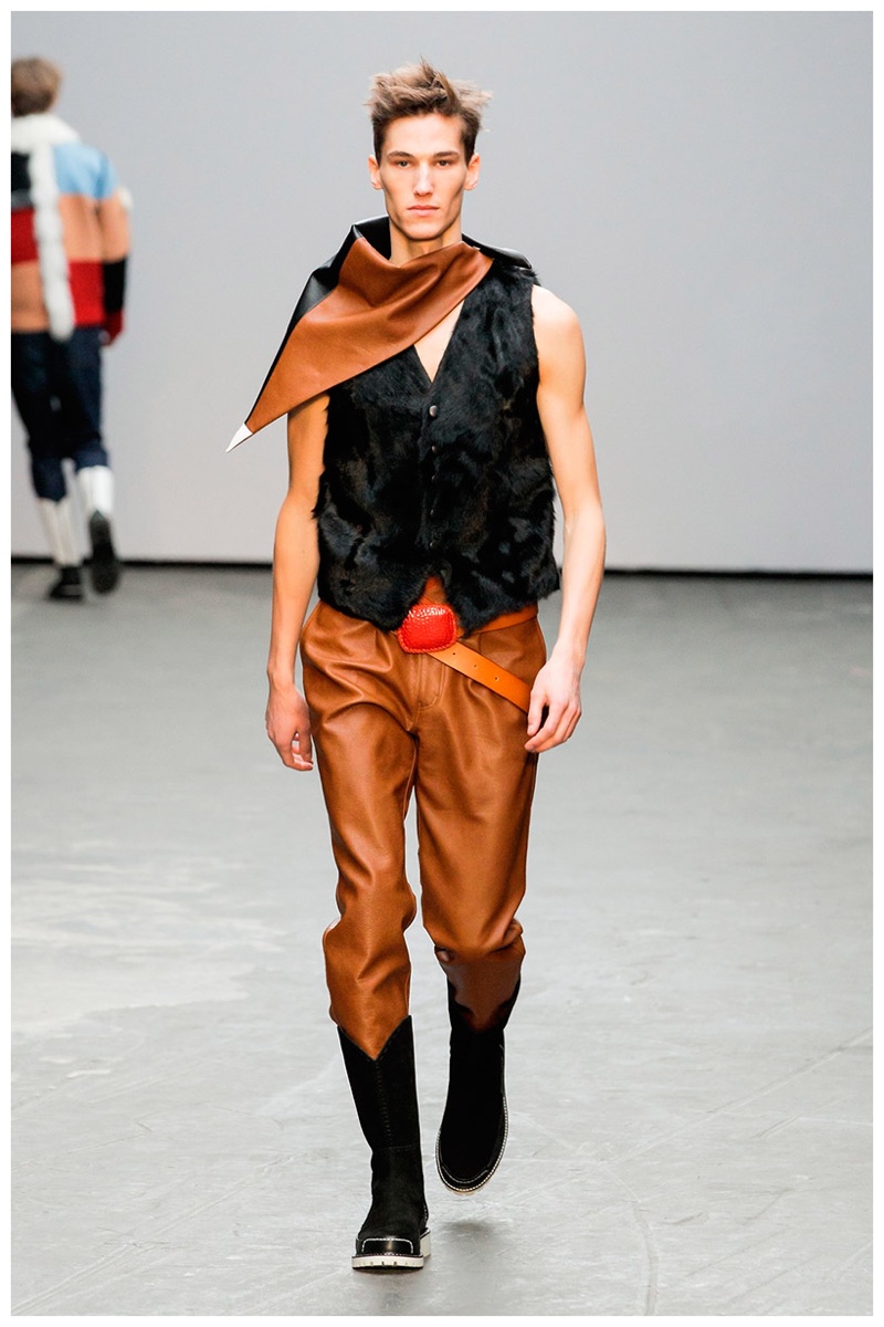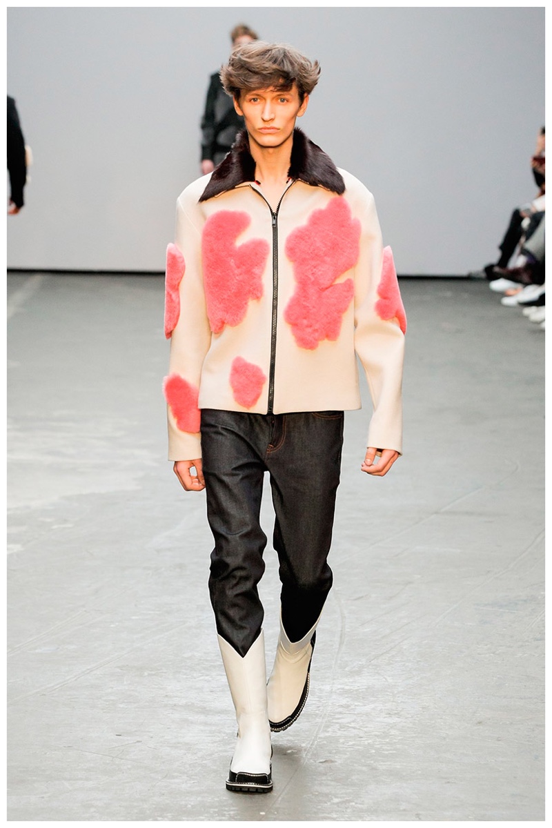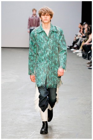 Offering a fresh take on the western motif, Xander Zhou kicked off the season with denim on denim, but didn’t end there. Joining iconic denim staples such as the the denim jacket and ripped denim jeans were embellished, long coats, fringed outerwear, brown leather shorts and color blocked separates.
