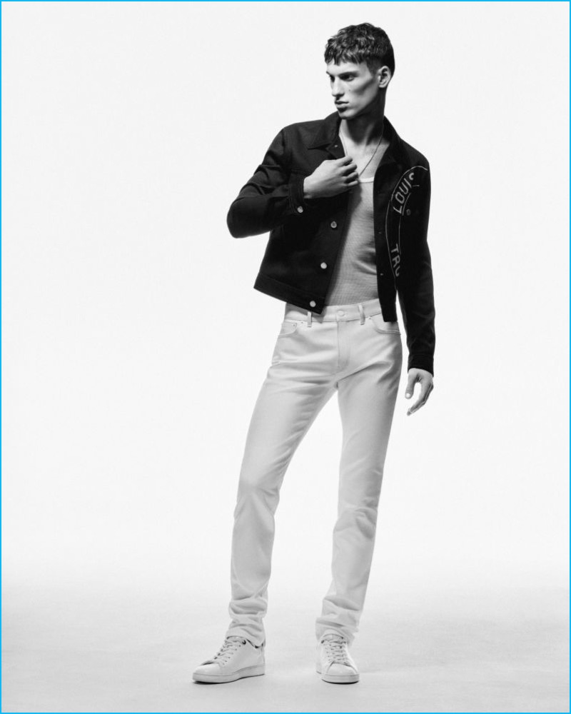 David Trulik dons white denim jeans from Louis Vuitton’s exclusive collection.