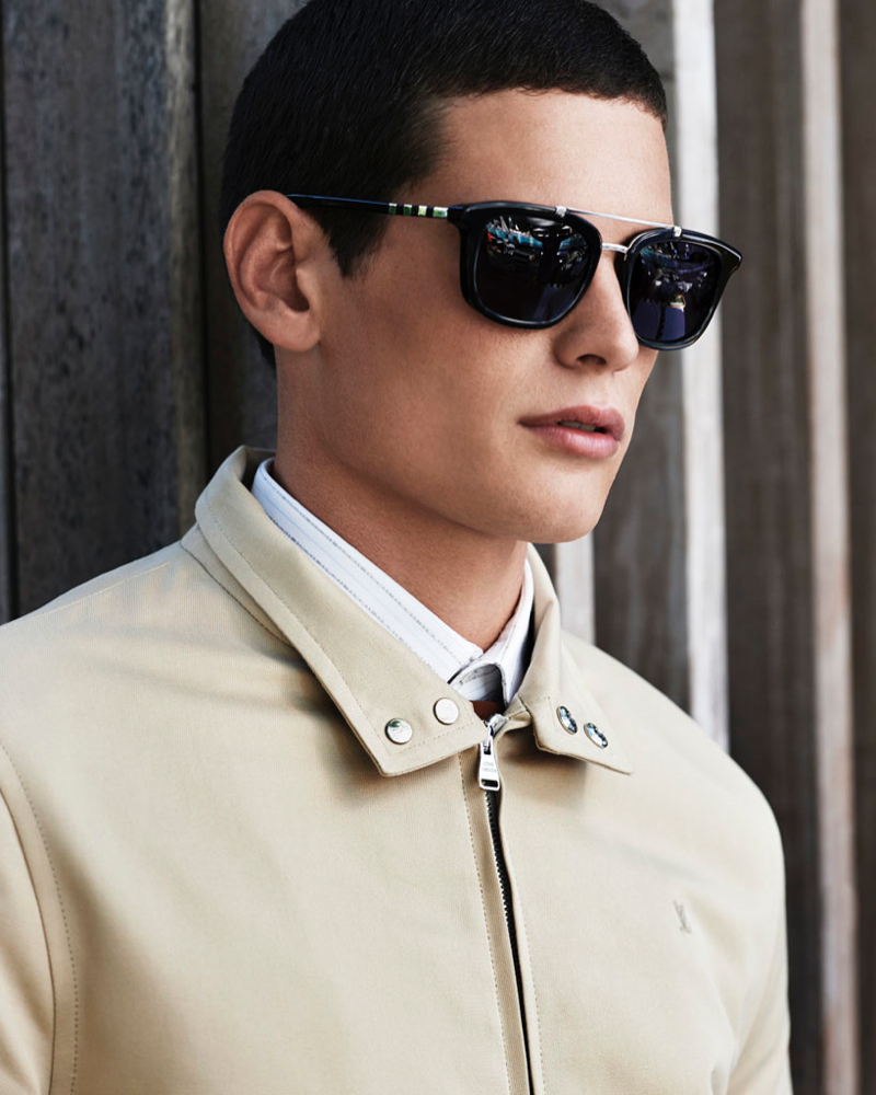 Louis Vuitton Summer 2014–French fashion house Louis Vuitton embraces a cool luxe attitude, approaching summer. Model Jeremie Laheurte appears in new images for the label, as he poses with Jessica Hart for photographer Bjarne Jonasson (Atelier Management). Relaxing poolside, Jeremie is styled by Jennifer Eymere, sporting modern shades, lightweight knitwear, hooded pullovers and casual t-shirts. / Hair by Virginia Le Fay. Makeup by Fady Malki.