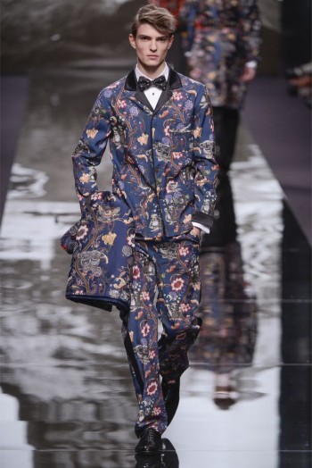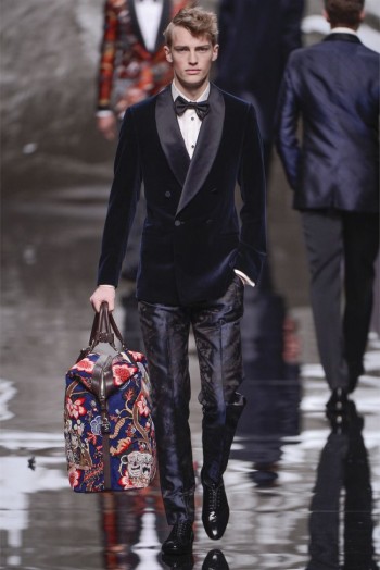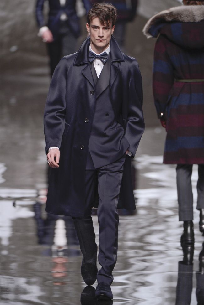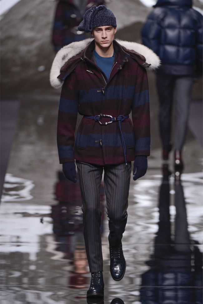 The Magic Mountain–For the fall/winter 2013 season, Louis Vuitton sends their stylish traveler to the Kingdom of Bhutan in the Himalayas. Traveling to the Himalayas himself to do research for the collection, Louis Vuitton men’s studio and style director, Kim Jones explains that the “collection is often an actual journey…it comprises what you take with you and what you bring back both physically and mentally from the experience.” Getting the most out of his travels, Jones was inspired by the appearance of snow leopards and tigers, which definitely played a hand in the collection’s signature print motif. Tackling the history of mountaineering, rugged silhouettes are mixed with the heritage of the French house for luxurious outerwear that showcases a playful masculine nature. Accented with furs and leathers, the core pieces reinforce the collection’s theme of adventure. Furthermore, borrowing from the Bhutanese, mixed patterns are inspired while blankets woven from cashmere are translated into ponchos. Rounded out by Louis Vuitton’s esteemed handiwork in the accessories department, the overall experience is a rich one.