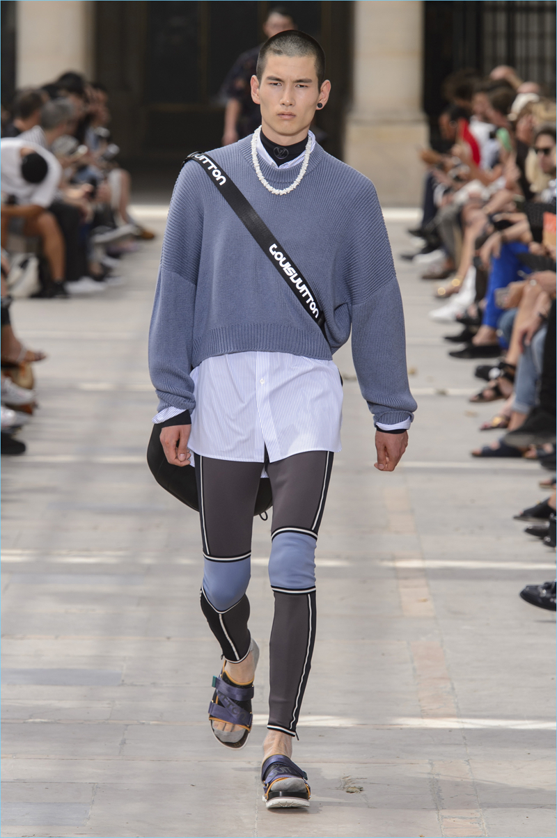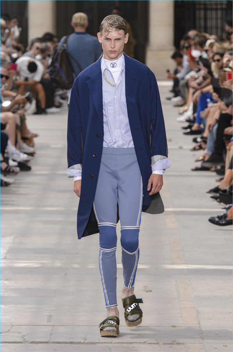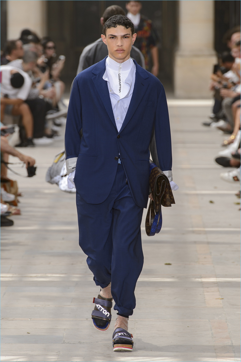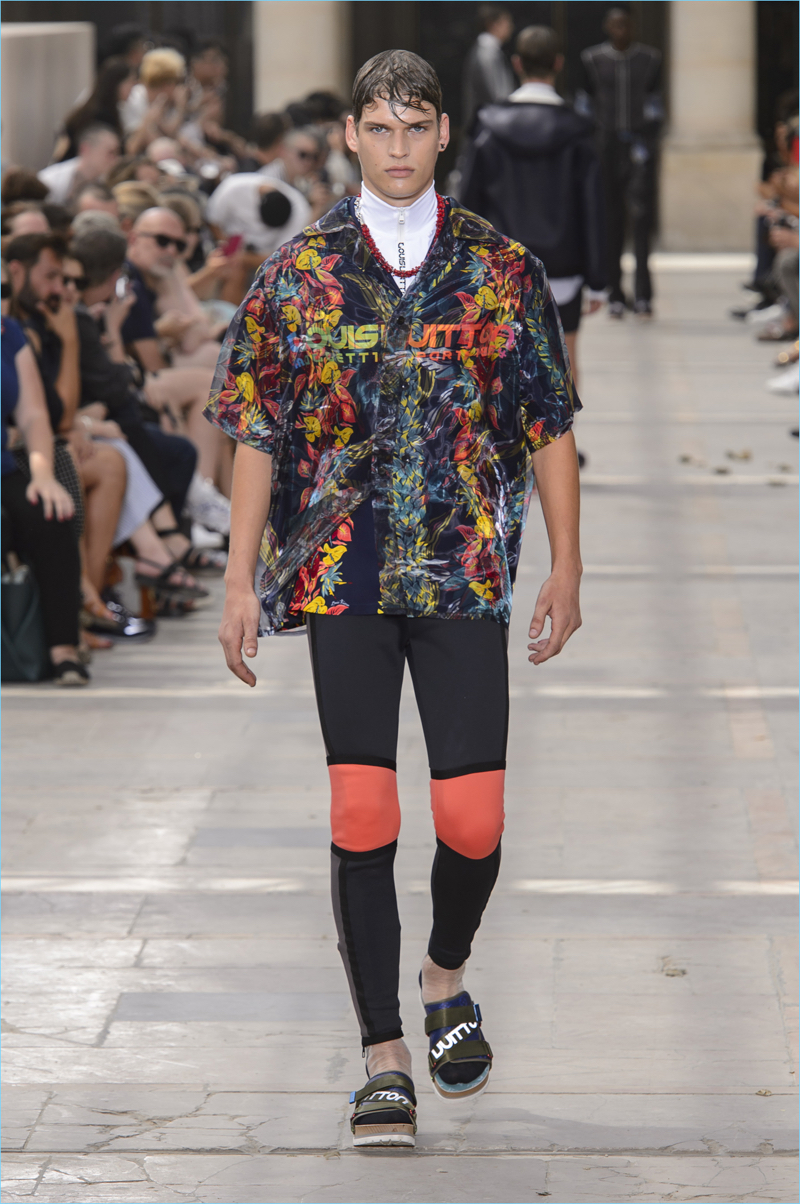 Kim Jones embraces a casual style narrative for spring-summer 2018. The British fashion designer showcases a tropical motif as he sends his latest Louis Vuitton collection down the catwalk. Tropical prints and a reimagined Louis Vuitton logo lend character to the season. However, a certain athleticism reigns with the insertion of scuba leggings and relaxed proportions. Amping up the cool factor, Drake releases a special song inspired by the collection, called “Signs.”
