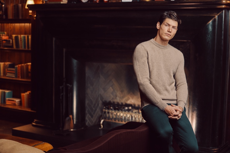 A smart vision, Sam Way wears Luca Faloni’s camel beige cashmere polo sweater.