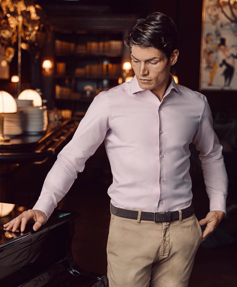 Sam Way sports Luca Faloni’s dove grey Siena piqué shirt.