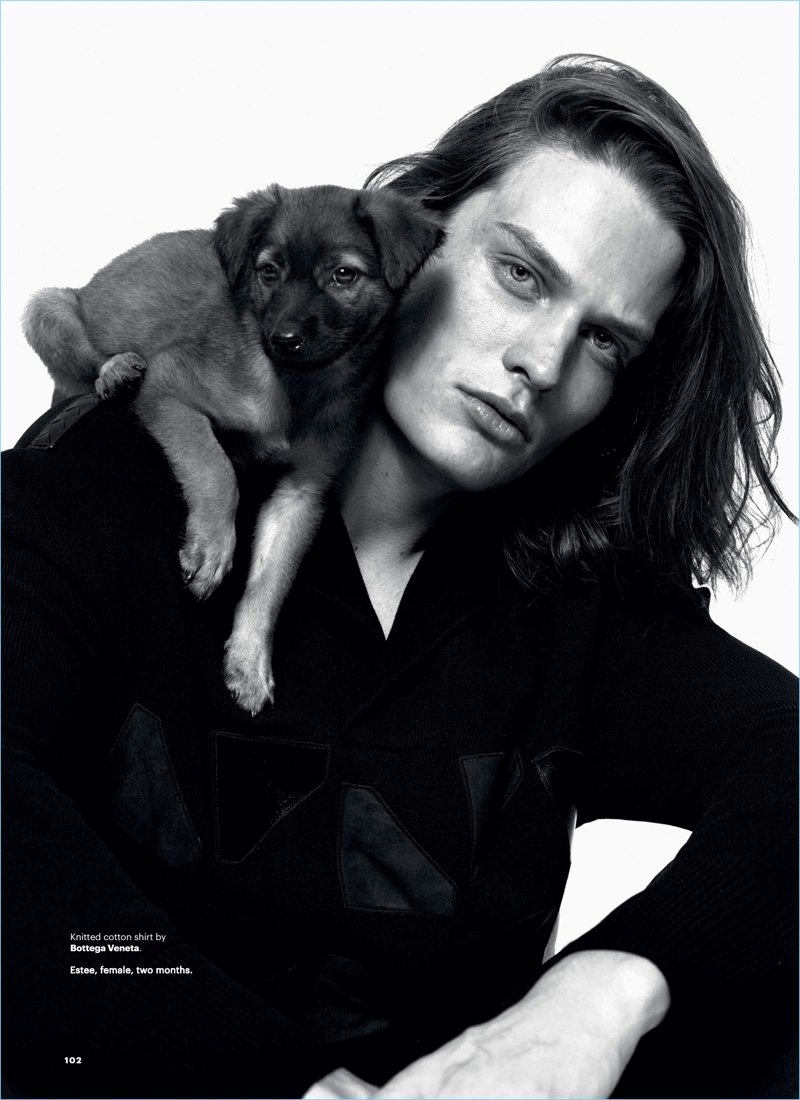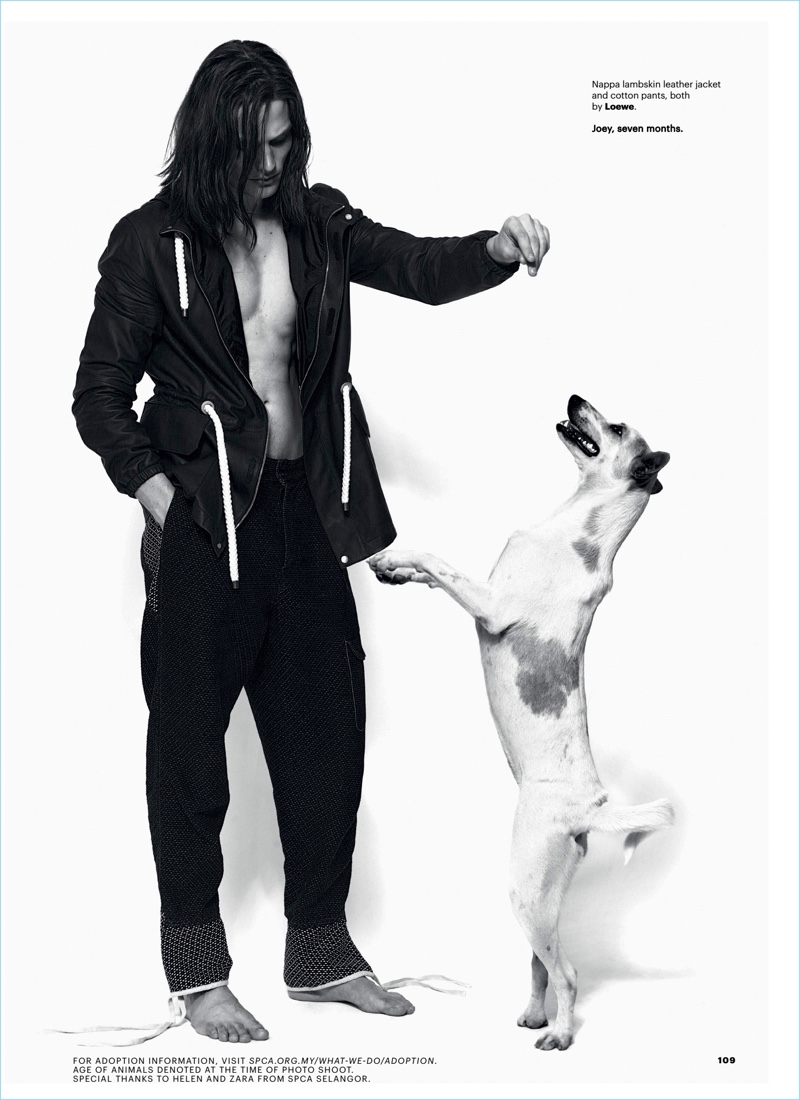 Esquire Malaysia teams up with SPCA for a new editorial featuring dogs and cats, available for adoption. Taking to the studio and posing with his new friends, Lucas Kittel stars in the story. The Brazilian model links up with stylist Ian Loh to wear monochromatic designer looks. Sporting the latest from brands such as Louis Vuitton and Bottega Veneta, Lucas charms for the lens of photographer, Kim Mun. / Art direction by Rebecca Chew. Grooming by Shawn Goh.