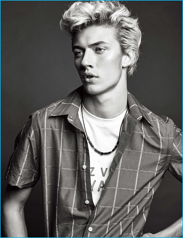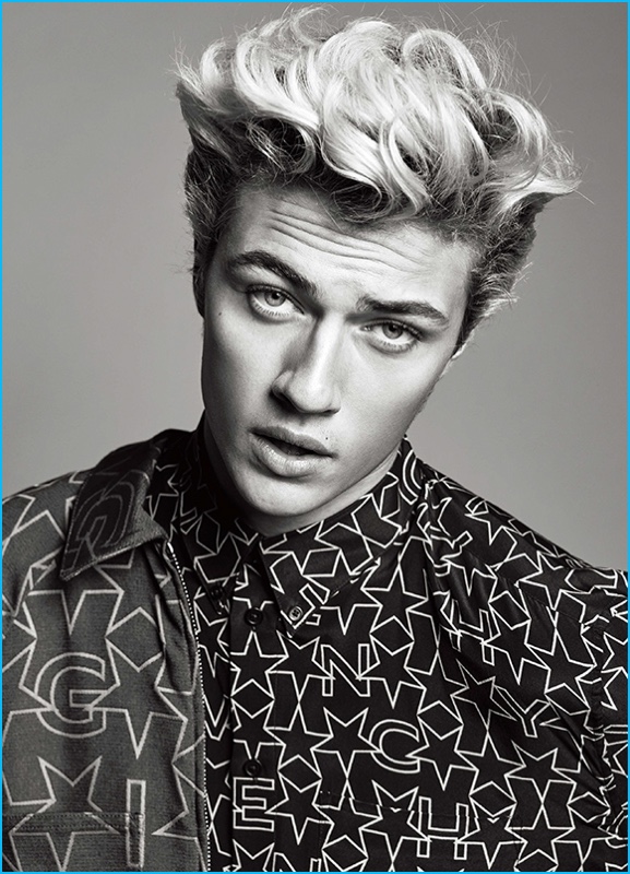 Dazed Korea cover star Lucky Blue Smith charms in a wardrobe of summer fashions for a shoot lensed by photographer Yeongjun Kim. Posing for a series of images taken indoors and outdoors, Lucky is captured in designer statement pieces. Prints, tailoring and bright colors are front and center for the occasion. Irresistible fashions range from Versace’s all-over print shirting to a graphic star number from Parisian brand Givenchy.