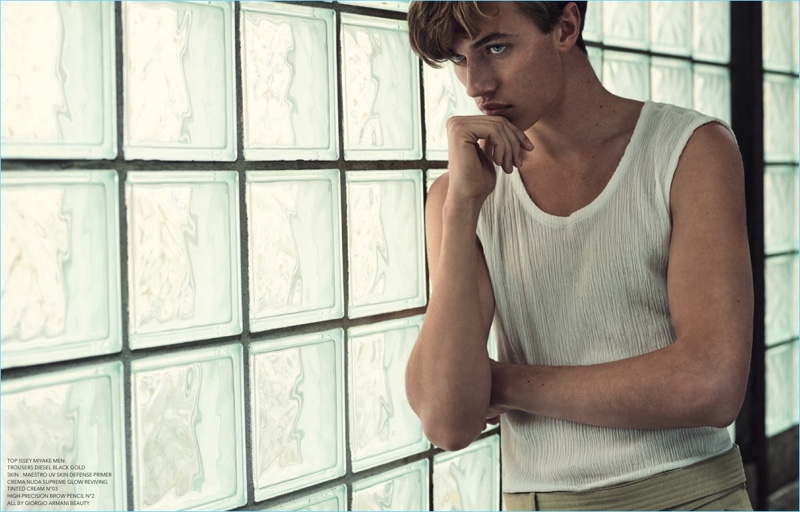 PinAmerican model Lucky Blue Smith wears a Bottega Veneta shirt, Issey Miyake belt, and Diesel jeans. He also sports Christian Louboutin sneakers.PinLeft: Lucky Blue Smith wears a Maison Margiela bomber jacket with Michael Kors shorts. Right: Lucky sports a mesh sweater by Dior Homme.PinLeft: Going shirtless, Lucky Blue Smith wears Diesel jeans. Right: Lucky models a Yohji Yamamoto shirt with a belt and trousers by Issey Miyake.PinDelivering a beauty close-up, Lucky Blue Smith wears a Maison Margiela sweater.