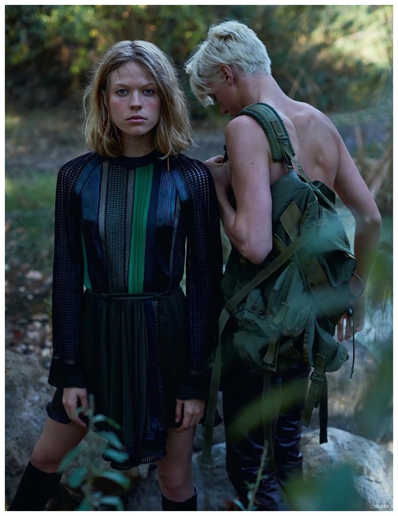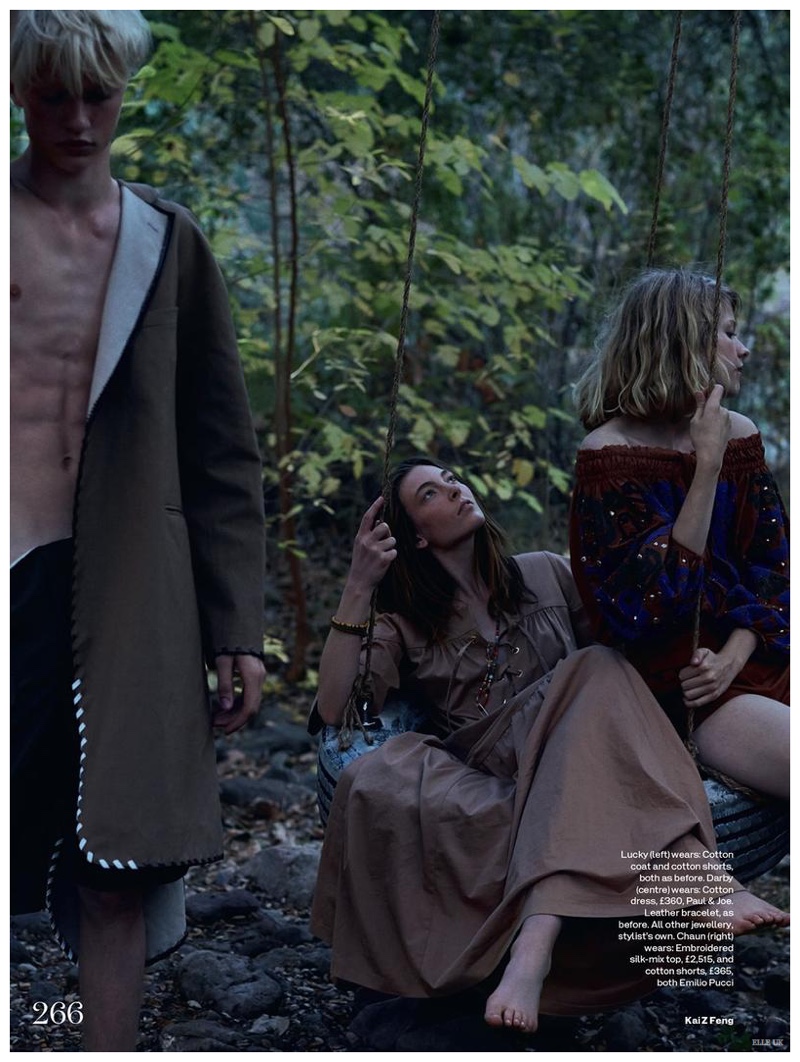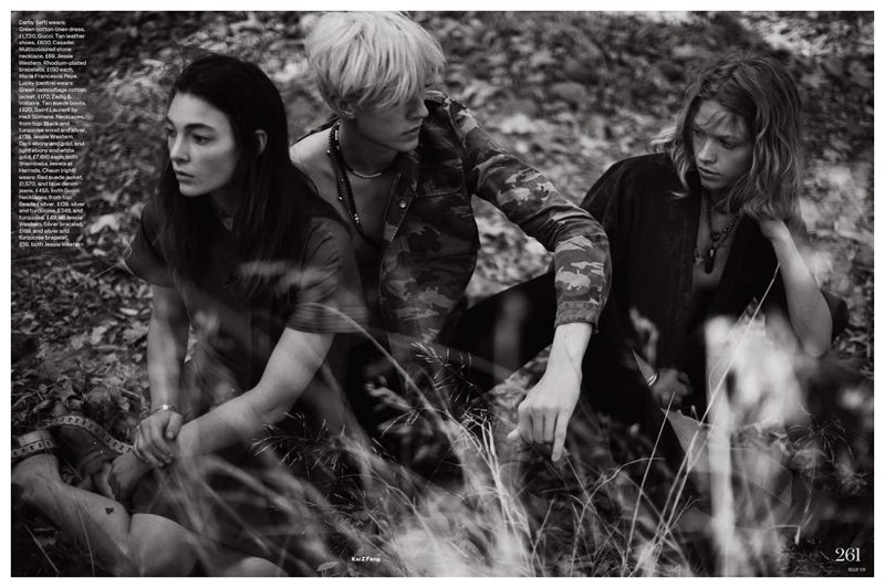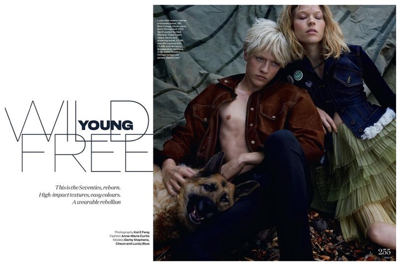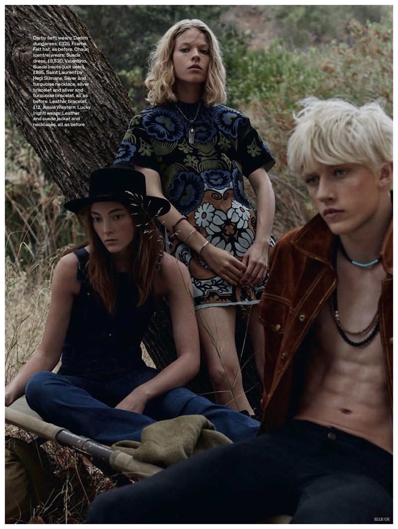 After fronting the H&M Loves Coachella Collection campaign, platinum blond model Lucky Blue Smith has a 1970s throwback with a new editorial for British Elle. Joining models Darby Stephens and Chaun, Lucky is outfitted by stylist Anne-Marie Curtis in looks that pay a nod to the 70s with lean denim jeans, suede jackets, and boots. / Photography by Kai Z Feng.