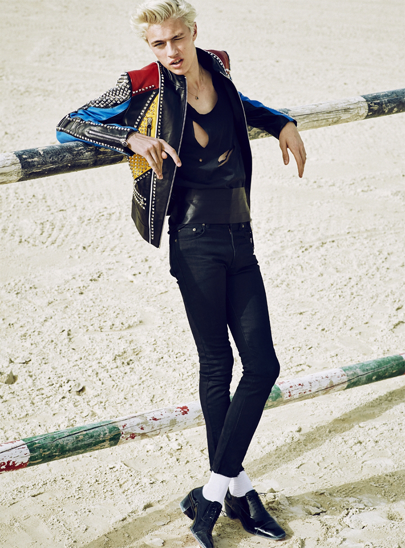 Lucky Blue Smith takes on the actions of a torero, wearing all clothes Les Hommes and shoes Christian Louboutin.