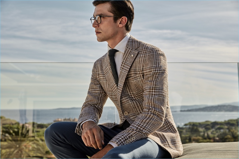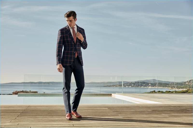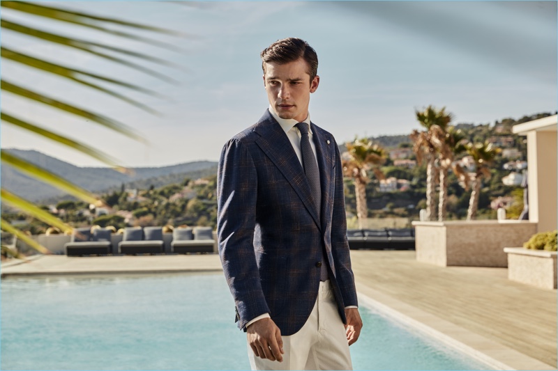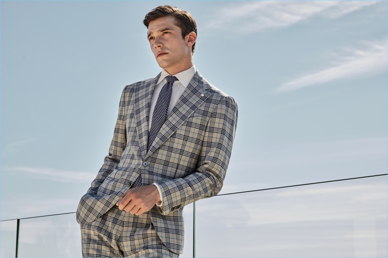 Model Alexis Petit sports a check blue suit from Luigi Bianchi Mantova.