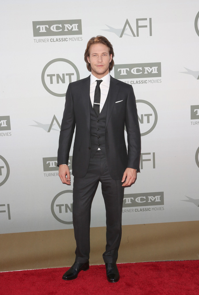 Bracey in Ermenegildo Zegna–Attending the AFI Life Achievement Award event honoring actress and humanitarian Jane Fonda, actor Luke Bracey hit the red carpet at the Dolby Theatre in Hollywood, California on June 5, 2014. For the special occasion, Bracey wore a gray three-piece suit with coordinated tie and shirt by Ermenegildo Zegna.