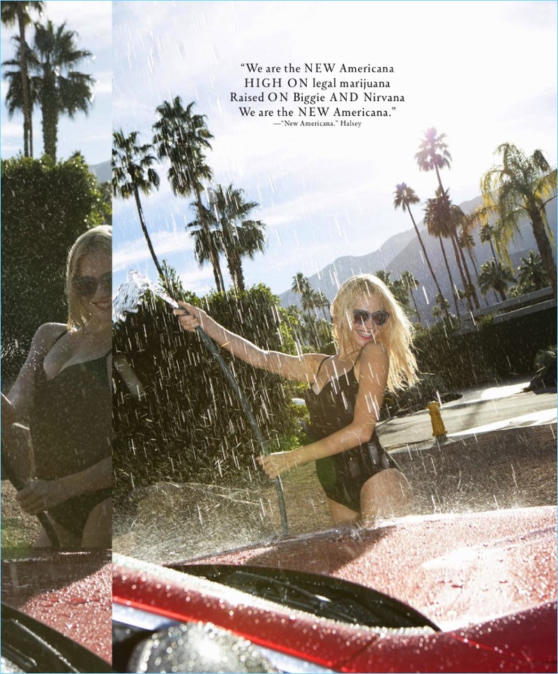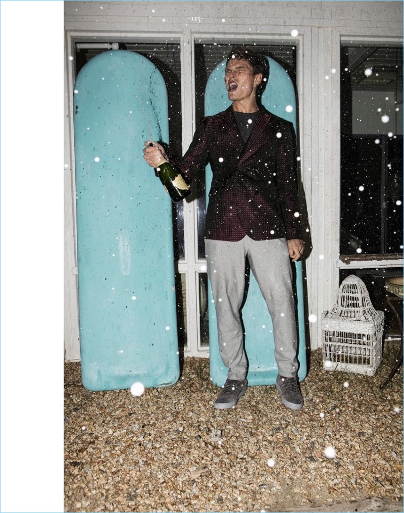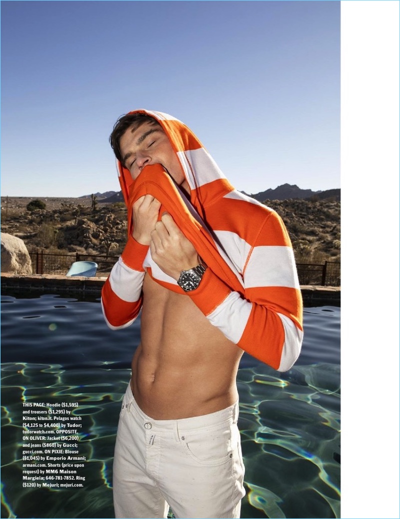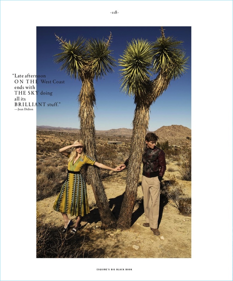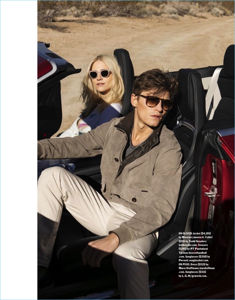 Oliver Cheshire and his girlfriend Pixie Lott hit the road for a new editorial. The couple stars in a vacation shoot for Esquire’s The Big Black Book. Photographer Marcelo Kracilcic captures the story as the pair takes to Palm Springs. Stylist Nick Sullivan envisions the perfect trip with quite the wardrobe. Oliver wears a mix of tailored and relaxed numbers. His outfits include a selection from brands such as Tom Ford, ISAIA, and Todd Snyder.