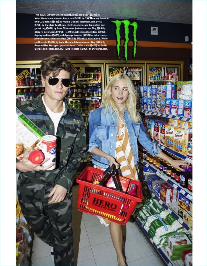 PinStarring in an editorial with his girlfriend Pixie Lott, Oliver Cheshire wears a Moorer jacket. Oliver also sports a Todd Snyder t-shirt and PT Pantaloni trousers with Persol sunglasses.